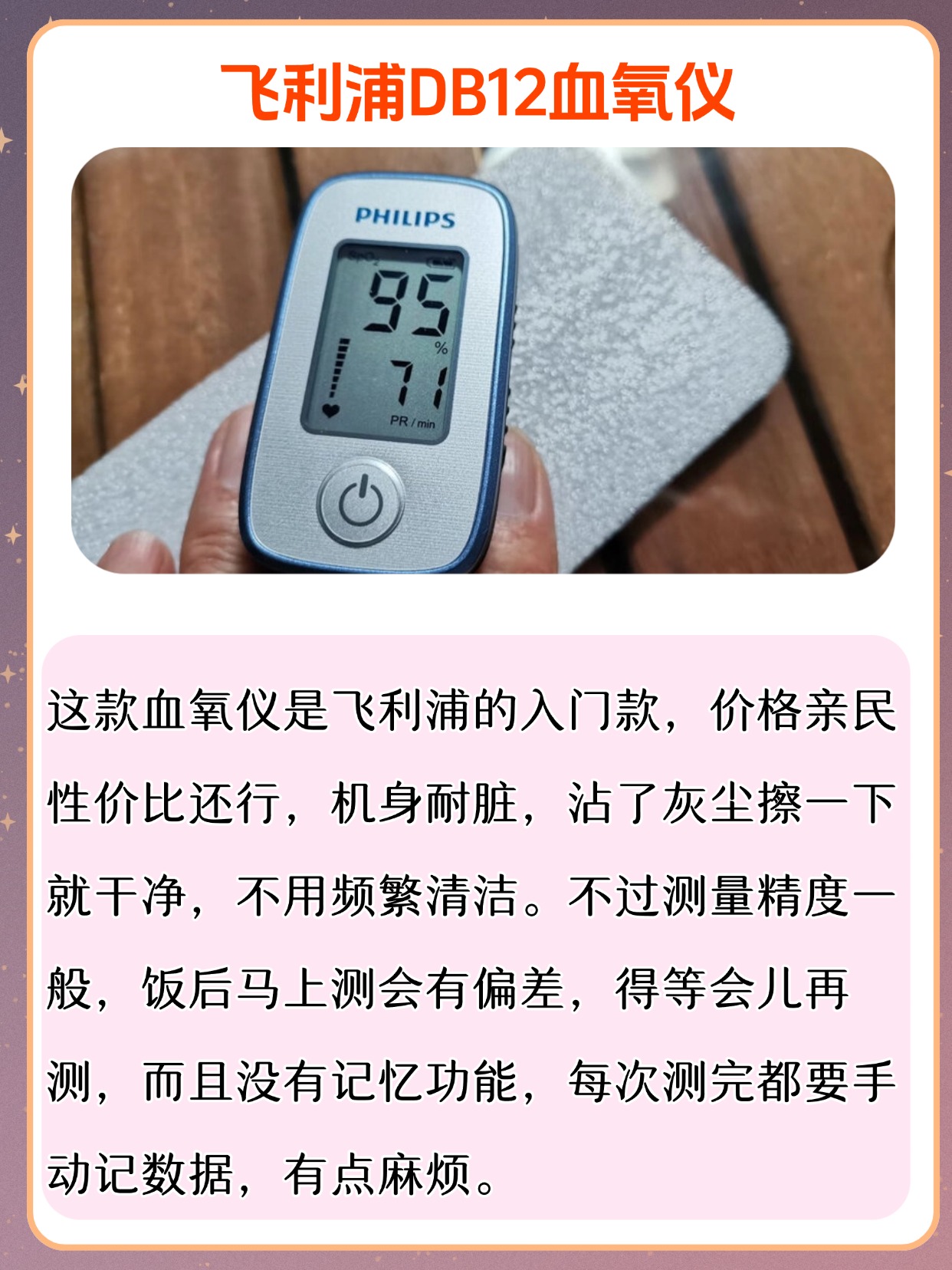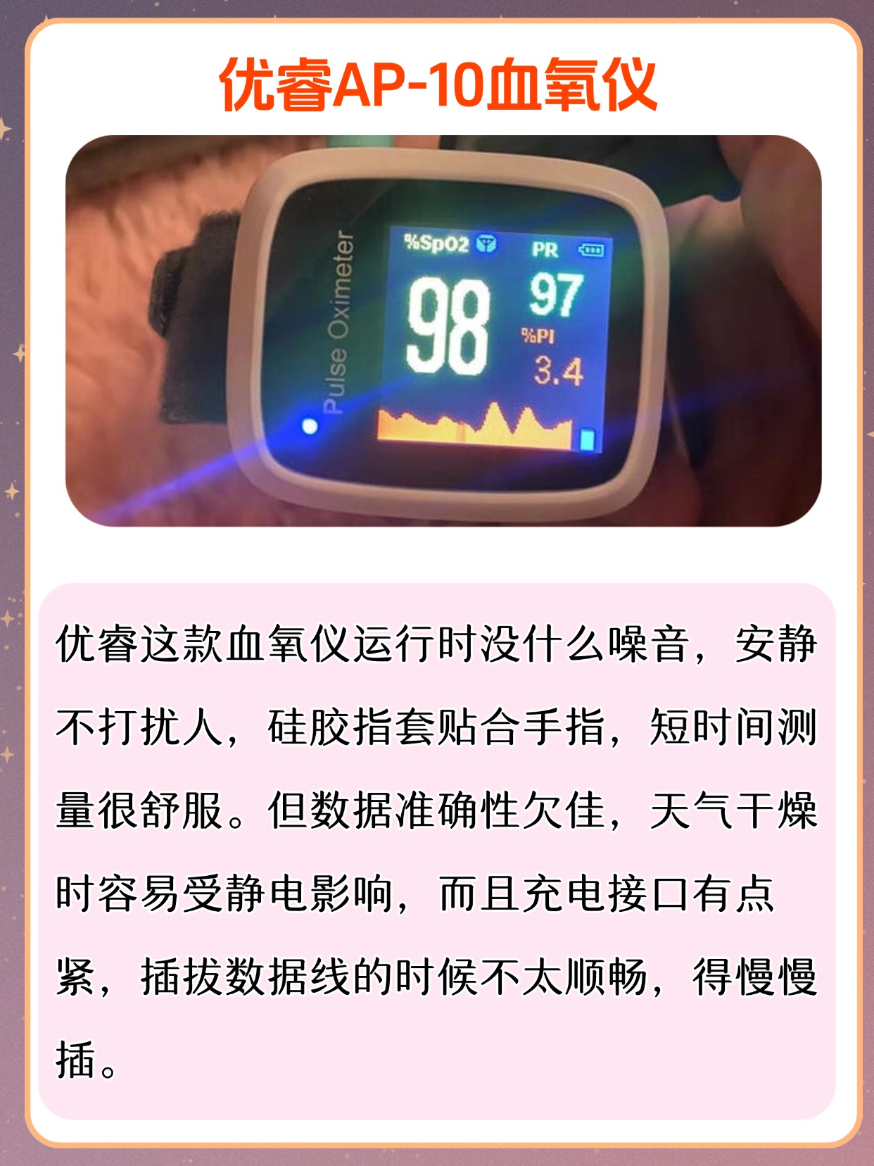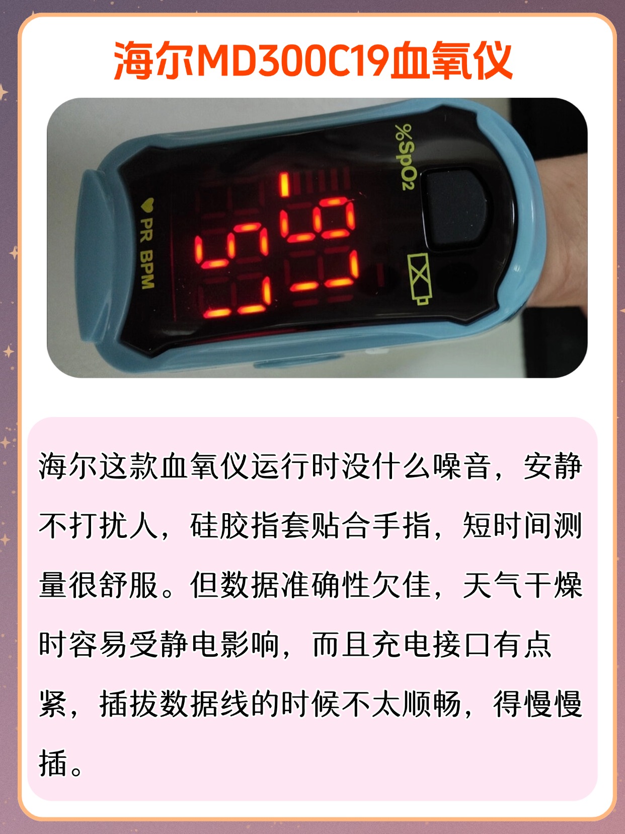 很多朋友问我,血氧仪是干什么用的,其实它就是用来监测血氧饱和度和脉率的家用小设备,平时在家随时能看数值,方便又直观,不少人还会问血氧仪是智商税吗,我可以很明确地说,它不是智商税,作为日常家用监测工具,能帮我们及时了解自身状态,尤其适合居家日常查看,使用的时候也很简单,把手指干净擦干,指甲朝上轻轻夹进仪器里,保持不动等几秒就能出结果,不用复杂操作,老人也能轻松上手,平时不管是自己用还是给家里人用,都能快速得到参考数值,不用来回跑外面测,日常备着确实挺实用,也能省去不少麻烦。下面是我总结的一些血氧仪选购注意事项,干货满满,可以先赞收藏。