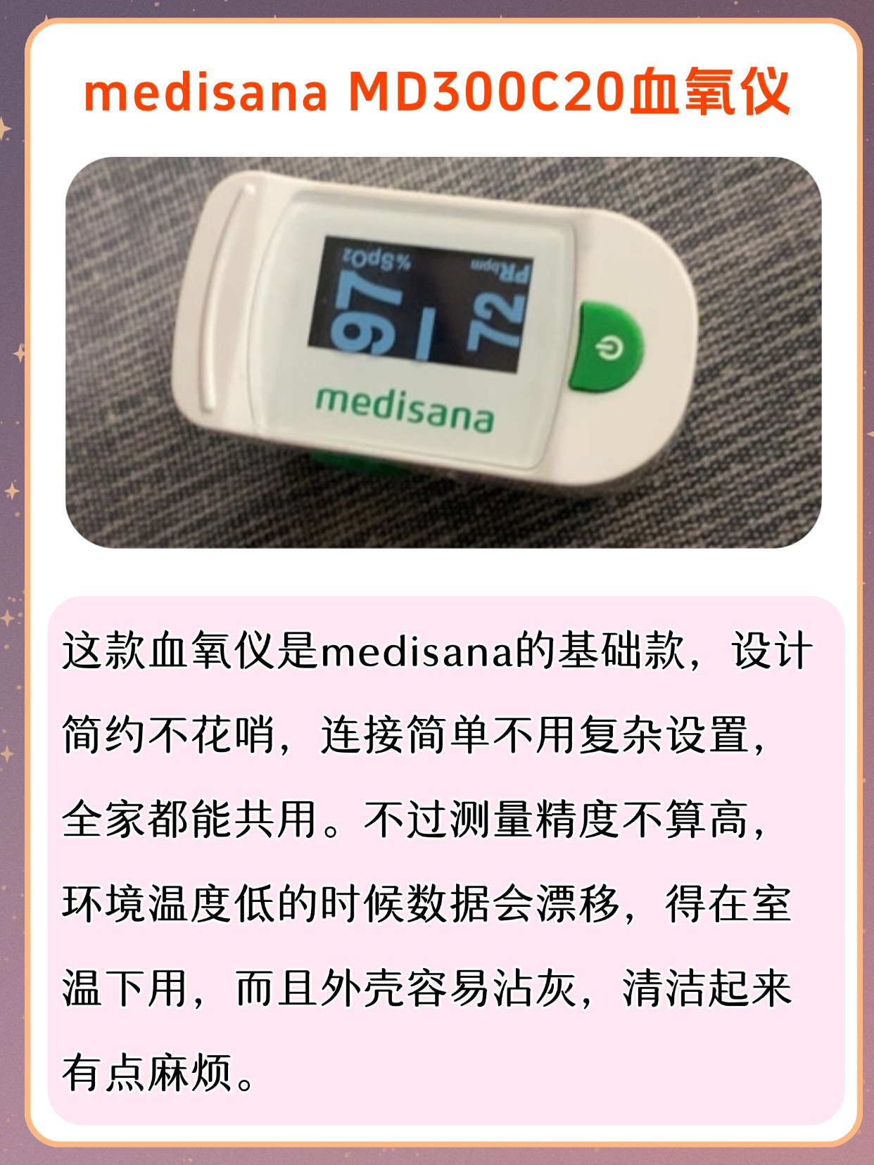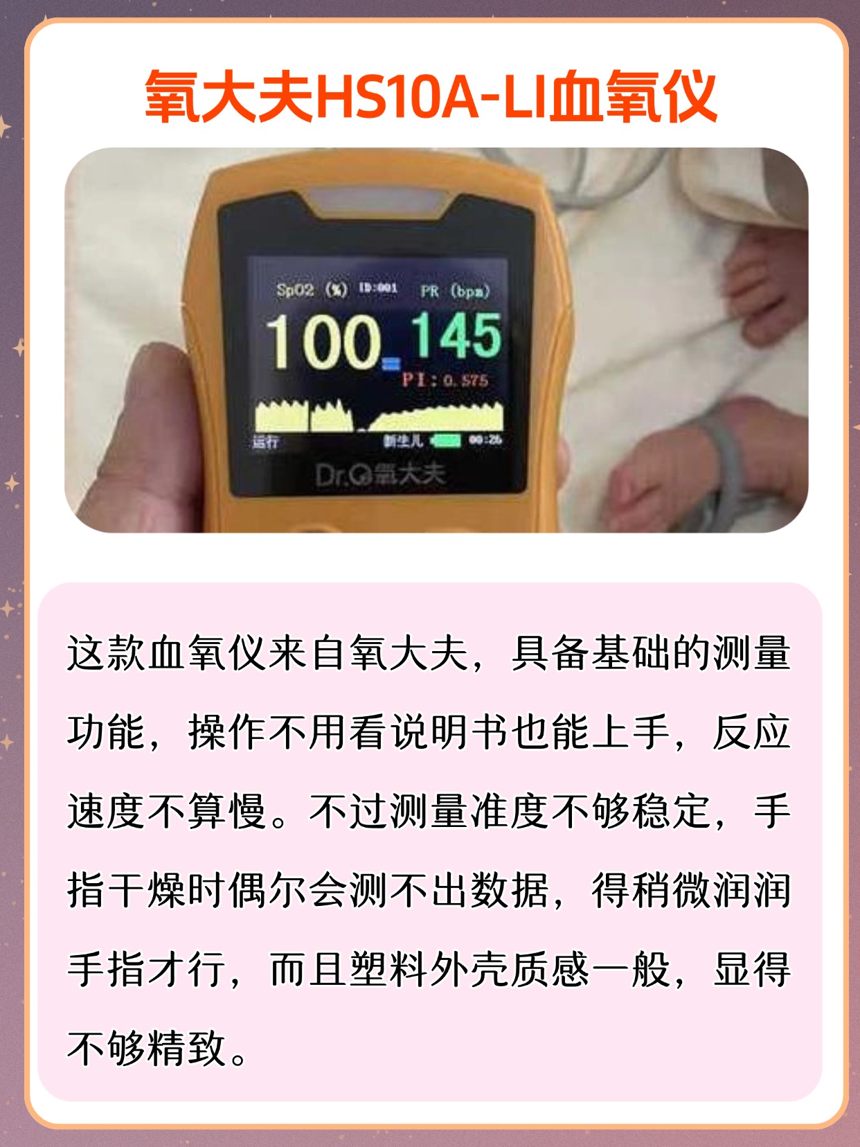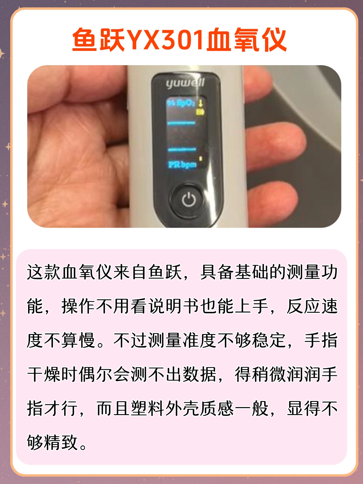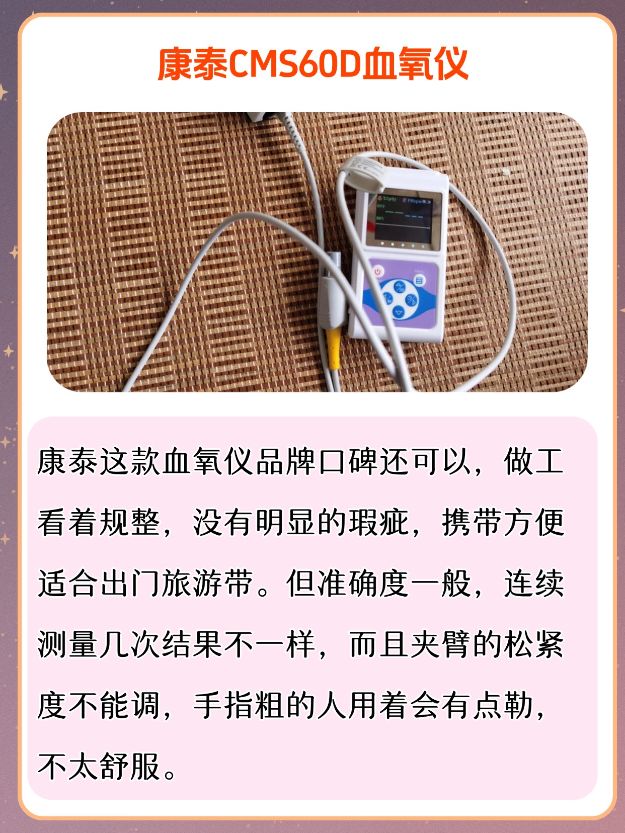 很多朋友问我,血氧仪是干什么用的,其实它就是用来监测血氧饱和度和脉率的家用小设备,平时在家随时能看数值,方便又直观,不少人还会问血氧仪是智商税吗,我可以很明确地说,它不是智商税,作为日常家用监测工具,能帮我们及时了解自身状态,尤其适合居家日常查看,使用的时候也很简单,把手指干净擦干,指甲朝上轻轻夹进仪器里,保持不动等几秒就能出结果,不用复杂操作,老人也能轻松上手,平时不管是自己用还是给家里人用,都能快速得到参考数值,不用来回跑外面测,日常备着确实挺实用,也能省去不少麻烦。下面是我总结的一些血氧仪选购注意事项,干货满满,可以先赞收藏。