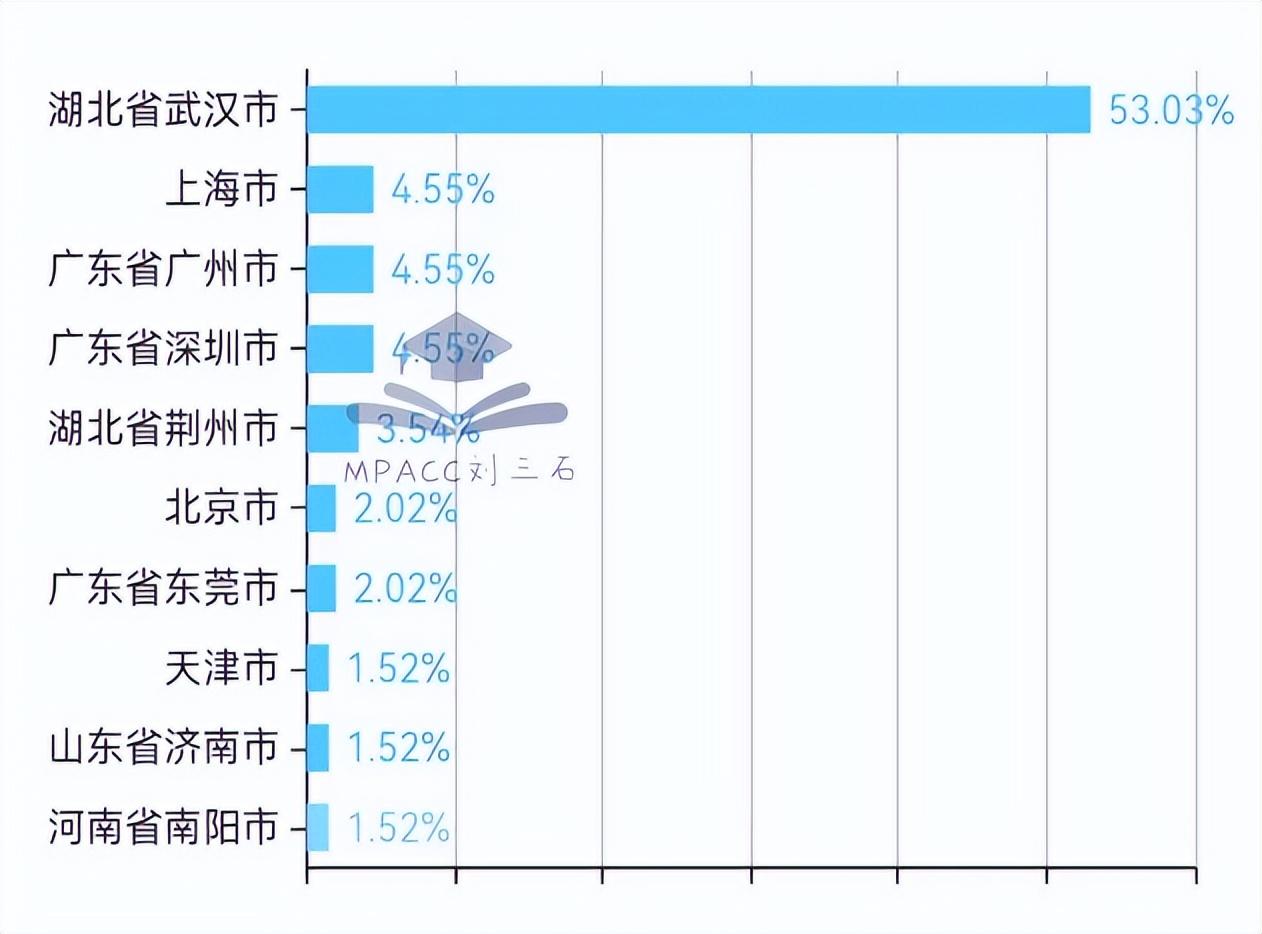 这个图上列示了武汉工程大学会计专硕的主要就业区域,我们可以看到主要的就业范围还是在湖北本省,基本上遍及湖北全省所有主要市区,另外就是珠三角,这里也有一些其他的城市,但是看到这些占比都是一样,老师估计是因为提供的样本很有限,所以最终产生这样的结果,实际上像是这一层次的院校,就业辐射范围基本局限在湖北省内。