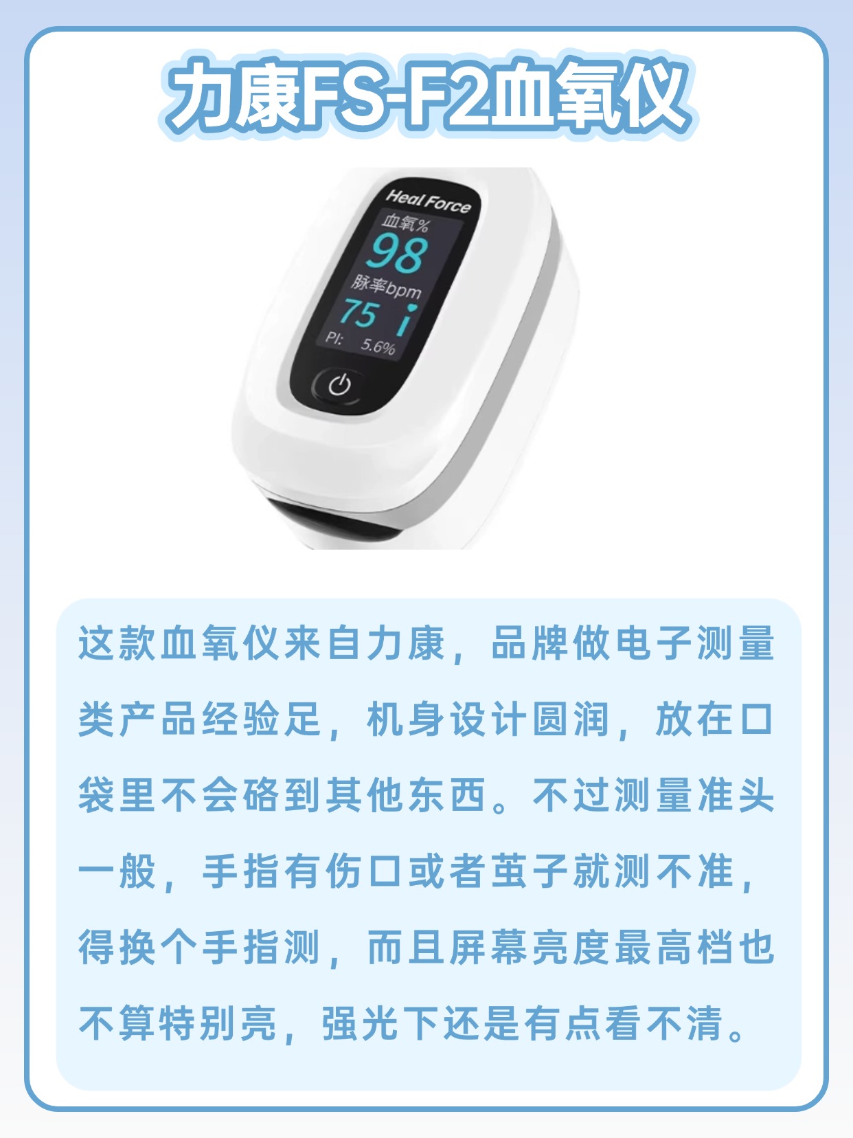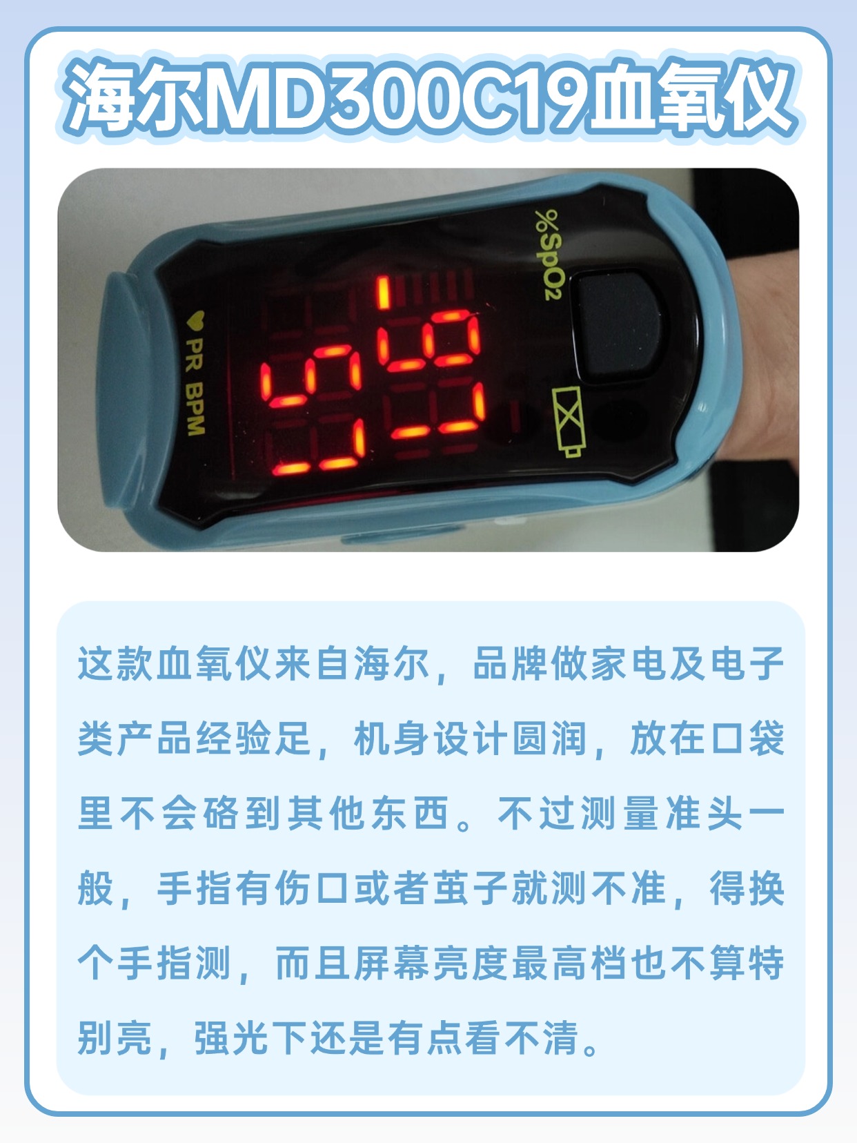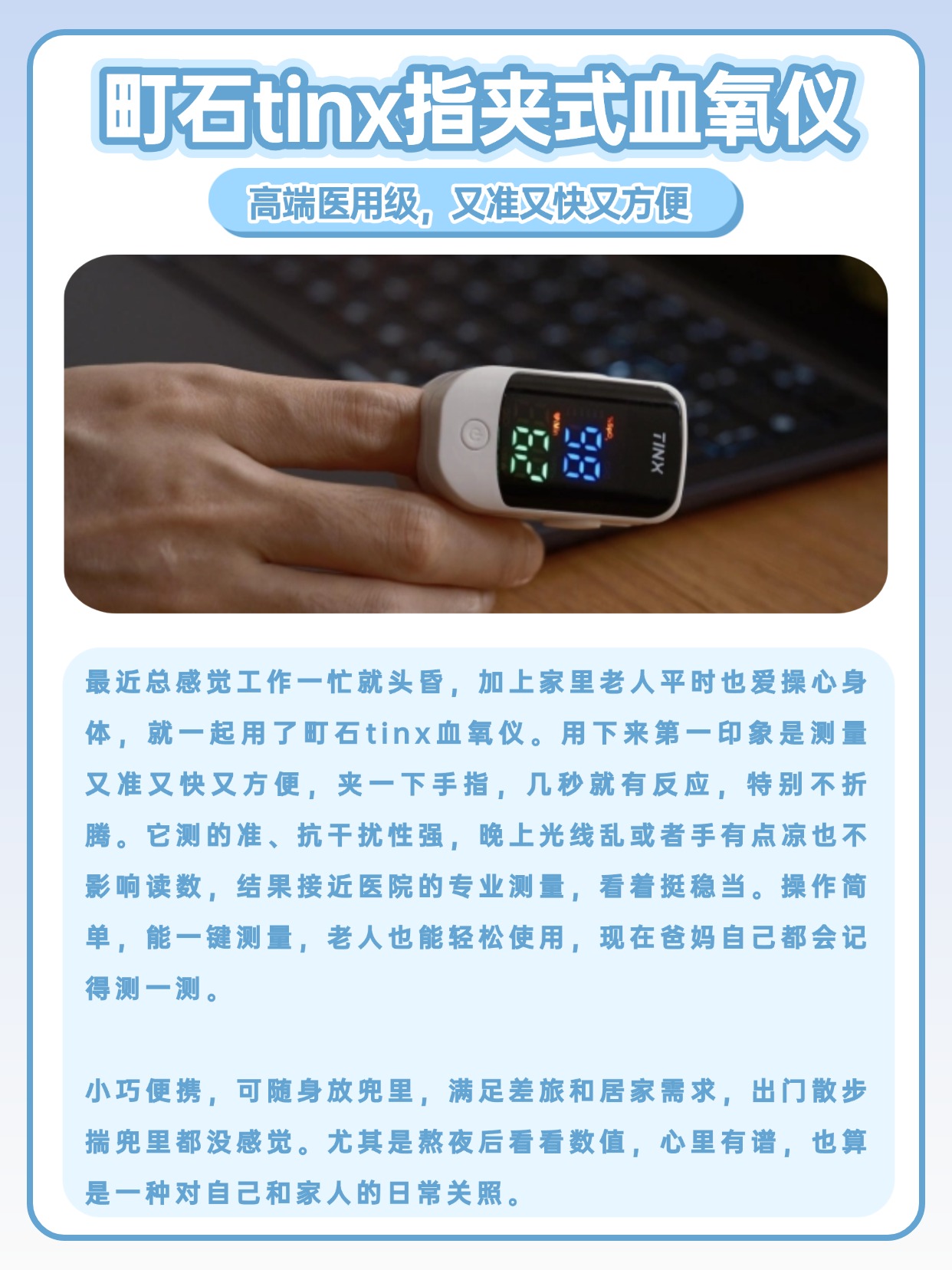 经常有人问我家用血氧仪有必要吗,以我长期测评的经验来看,日常居家备一个还是很有必要的,能随时查看血氧相关数值,满足日常监测需求,还有人问血氧仪正常值是多少范围,正常情况下常见的参考区间大家都能轻松了解,测量时只要操作规范,数值就能稳定显示,使用前记得把手指擦干净,不要有汗渍或者异物,夹的时候保持手指平稳,别晃动,等待几秒等数值稳定就可以,不管是自己测还是给家人测,步骤都很简单,上手零难度,日常用起来省心又方便,也不用担心理解不了数值。下面是我总结的一些血氧仪选购注意事项,干货满满,可以先赞收藏。