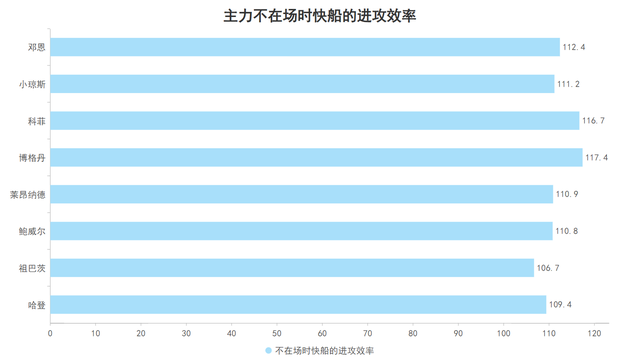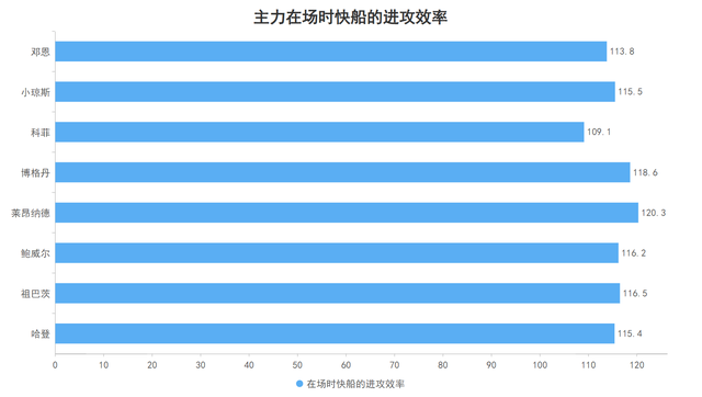 总体来看,快船的主力阵容有7人的净效率均在0以上,这意味着此7名主力在场时快船每百回合均是处于净胜对手的状态,主力阵容几乎全员稳定的净胜对手也令快船本赛季的净效率达到了一个较高的水准: