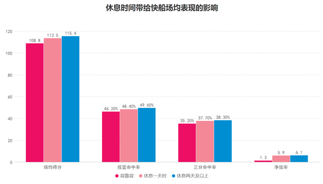 那么快船本赛季的问题缺陷在哪里呢?是什么限制了他们的战绩无法更进一步呢?除了伤病休战的原因,快船本赛季背靠背出战时无论是场均得分、两项命中率还是净效率均低于休息一天后出战,而休息一天后出战的表现又均低于休息两天及以上出战,这意味着快船不适合短时间内的连续作战,这当然也在情理之中: