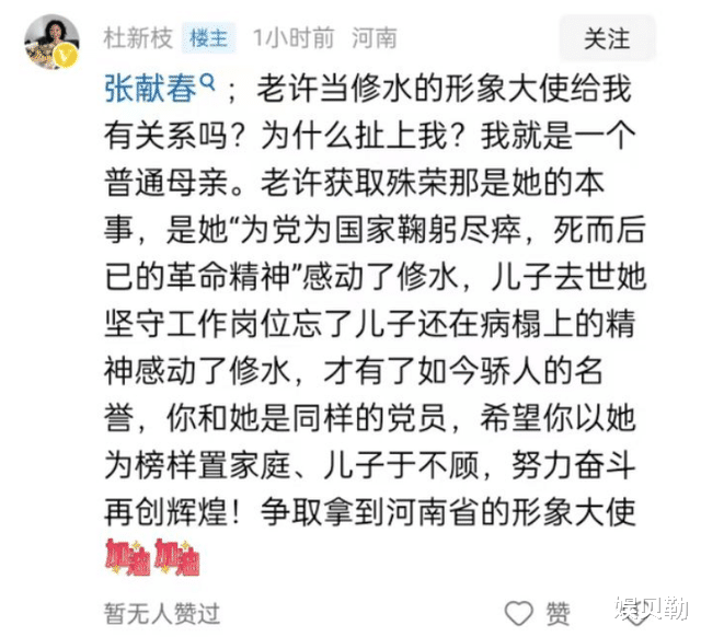 只是杜新枝内涵许敏的文字,网友并不认可,比如杜新枝表示儿子去世她也坚守工作岗位,忘了儿子还在病榻上的精神感动了修水,才有了如今骄人的名誉。