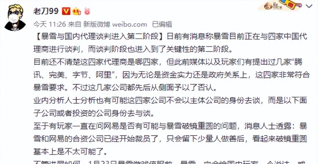 根据国内著名舅舅党“老刀99”的爆料来看,暴雪目前已经跟四家国内游戏厂商达成初步的合作意向,谈判进入到了关键性的第二阶段,也就是说如果谈判顺利的话,暴雪全家桶有可能会重现十三年前万年TBC的情况,在上一家代理商取消合作后,下一家代理商先运营目前的版本,再去审批新的游戏版号。