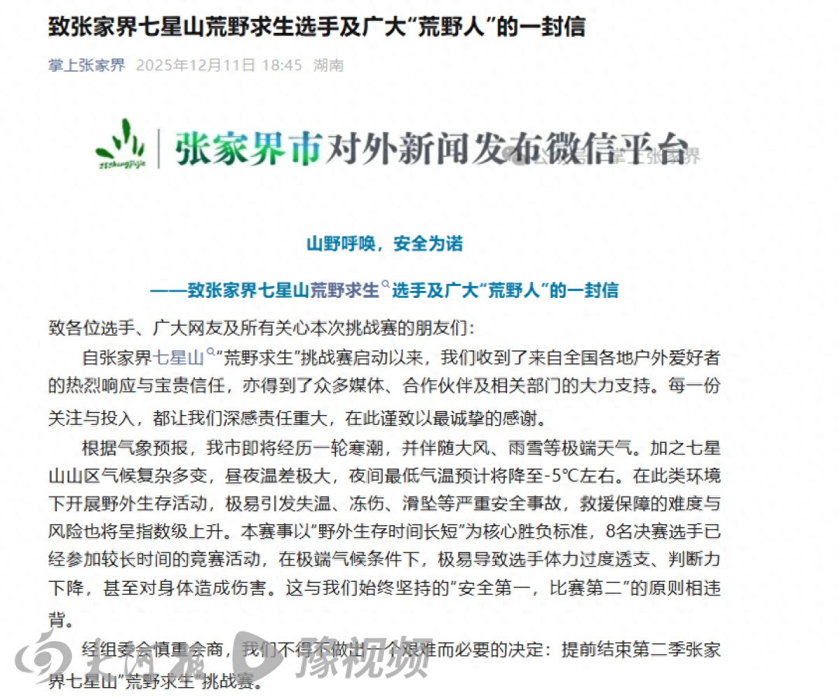 12月11日18时45分,“掌上张家界”微信公众号发文称提前结束第二季张家界七星山“荒野求生”挑战赛。