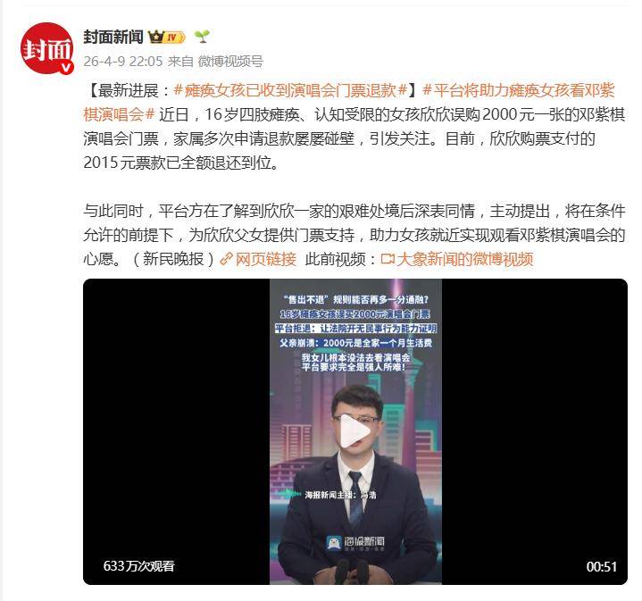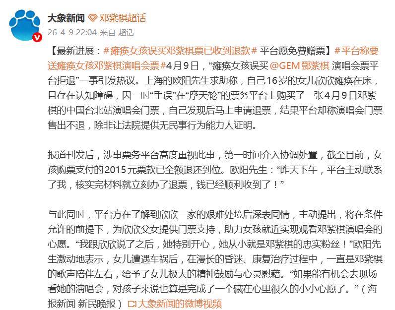 但故事的温暖并未止步于“退款成功”。平台方在深入了解欣欣一家的艰难处境后,做出了一个超出预期的承诺:他们主动提出,将在条件允许的前提下,为欣欣父女提供门票支持,助力女孩就近实现观看邓紫棋演唱会的心愿。