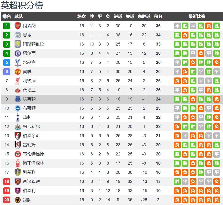 第一:两队情况!英超16轮战罢,埃弗顿7胜3平6负积24分排名第九,阿森纳11胜3平2负积36分排名第一,但仅领先第二名曼城2分。上轮英超,埃弗顿客场0-2不敌切尔西,联赛两连胜被终止;阿森纳靠2个乌龙球,主场2-1险胜狼队,球队近3个联赛主场均没有赢球。