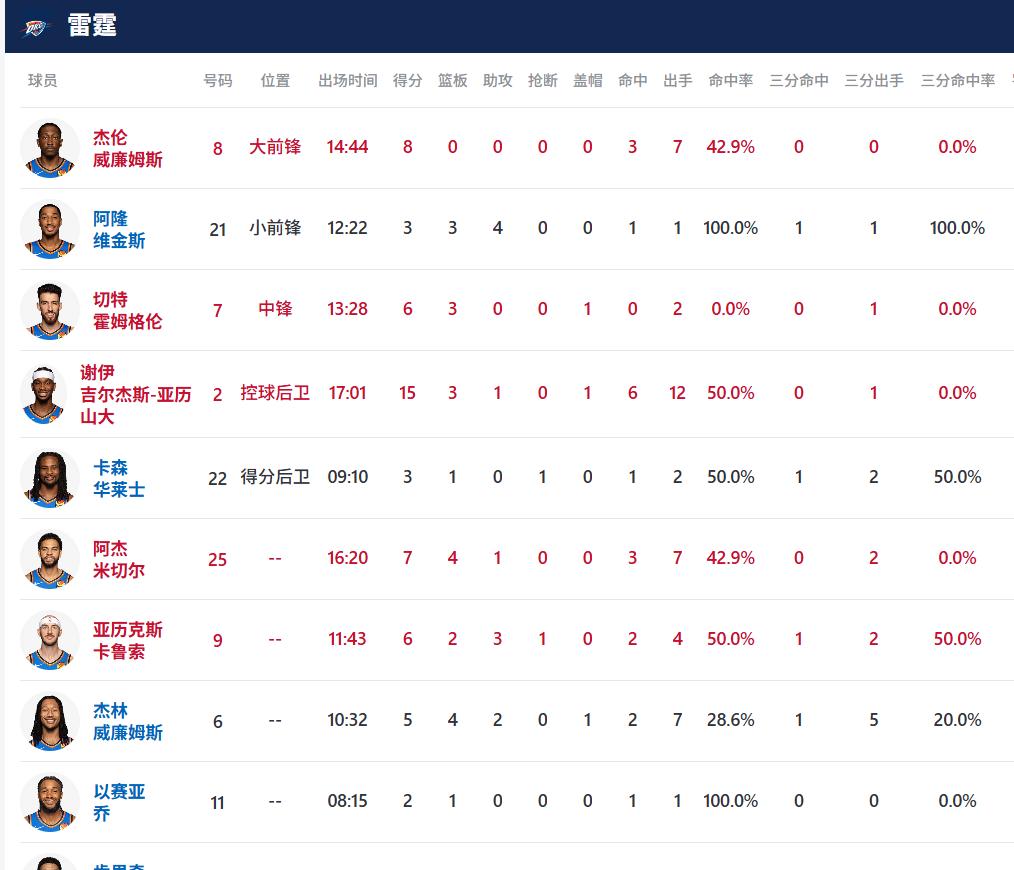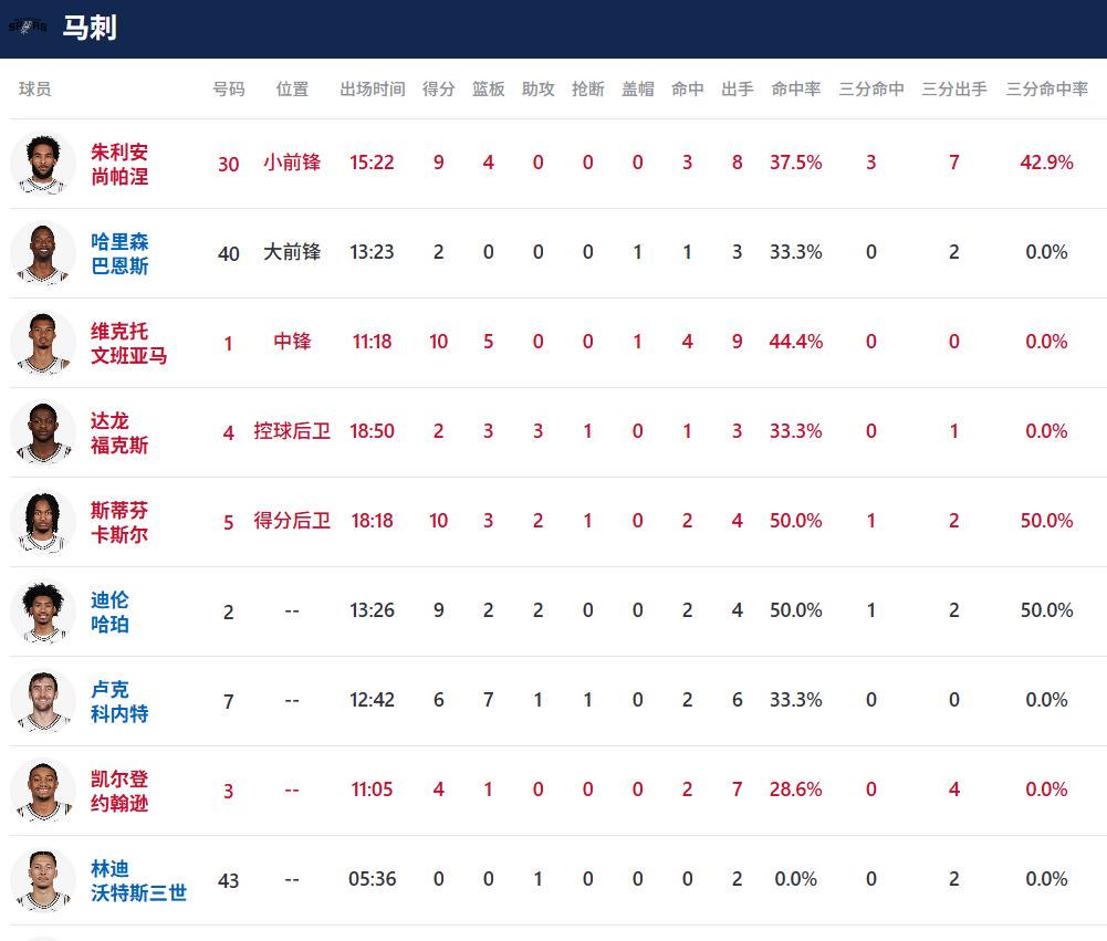 数据方面,雷霆的亚历山大半场轰下15分,马刺的文班亚马与雷霆的斯蒂芬·卡斯尔均收获10分,成为各自球队的重要得分点。