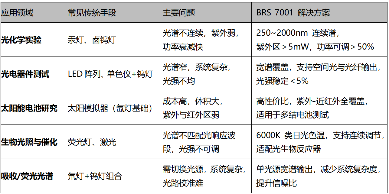 结语:BRS-7001 ——您的高功率宽谱光引擎BRS-7001大功率氙灯光源凭借其宽光谱、高稳定、双输出、易维护等特性,已成为光化学、光电测试、太阳能研究、生物光照与光谱分析等领域中的理想选择。它不仅解决了传统光源在多波段、高功率、长时稳定方面的不足,更以模块化、用户友好的设计,助力科研与工业用户构建更可靠、更高效的光学实验平台。