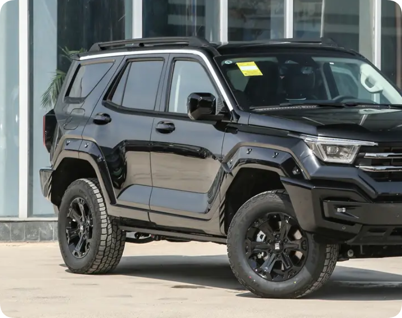 在车身尺寸方面,新车的长度、宽度和高度为4985/1960/1905毫米,轴距为2850毫米。所以侧面来看非常霸气,开出去也是非常有面子,尤其是车身笔直的线条配合车门内凹的设计,让侧面看起来更有质感。同时,黑色轮毂以及机械门把手,还有超高的离地间隙都是这款车的卖点。从乘坐体验来看,这款车挺高,如果标配踏板就更好了。不过,座椅的包裹性很有弹性,避震和舒适性的调校刚好,遇到颠簸路况也不会那么生硬,整体的舒适不错。当然,尾部的配有备胎,尾灯与前灯的设计呼应,也有配有翼子板等套件,不论是家用还是自驾游都是能够满足的。