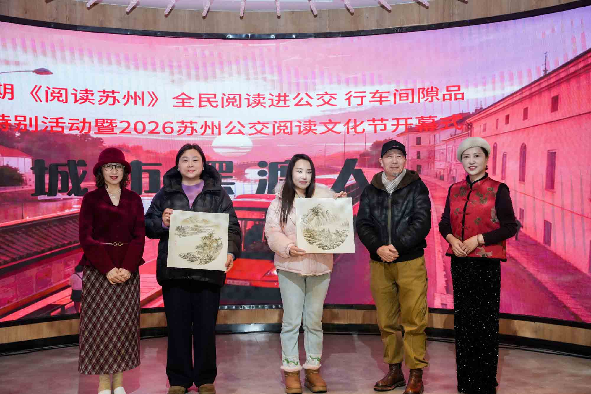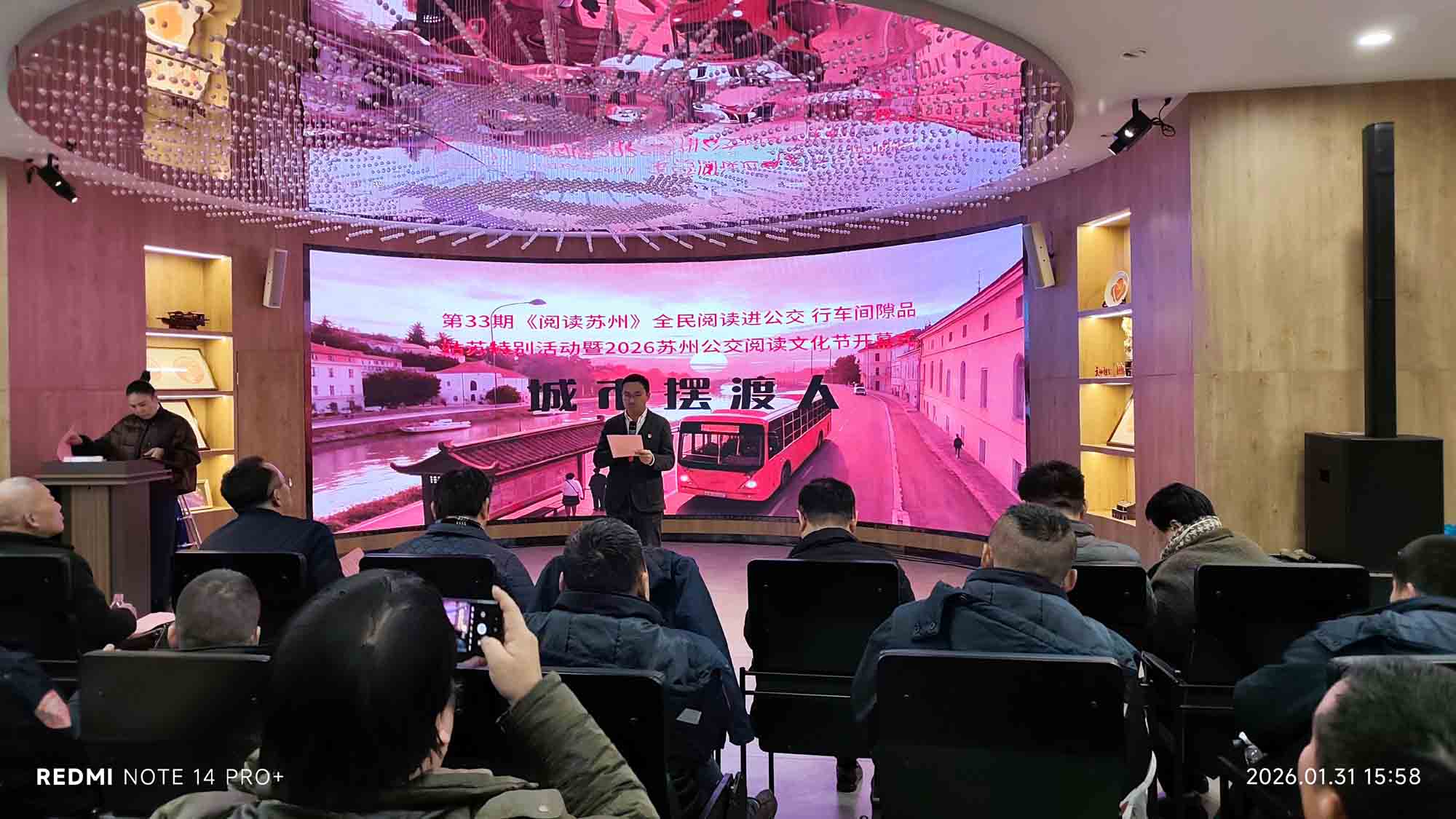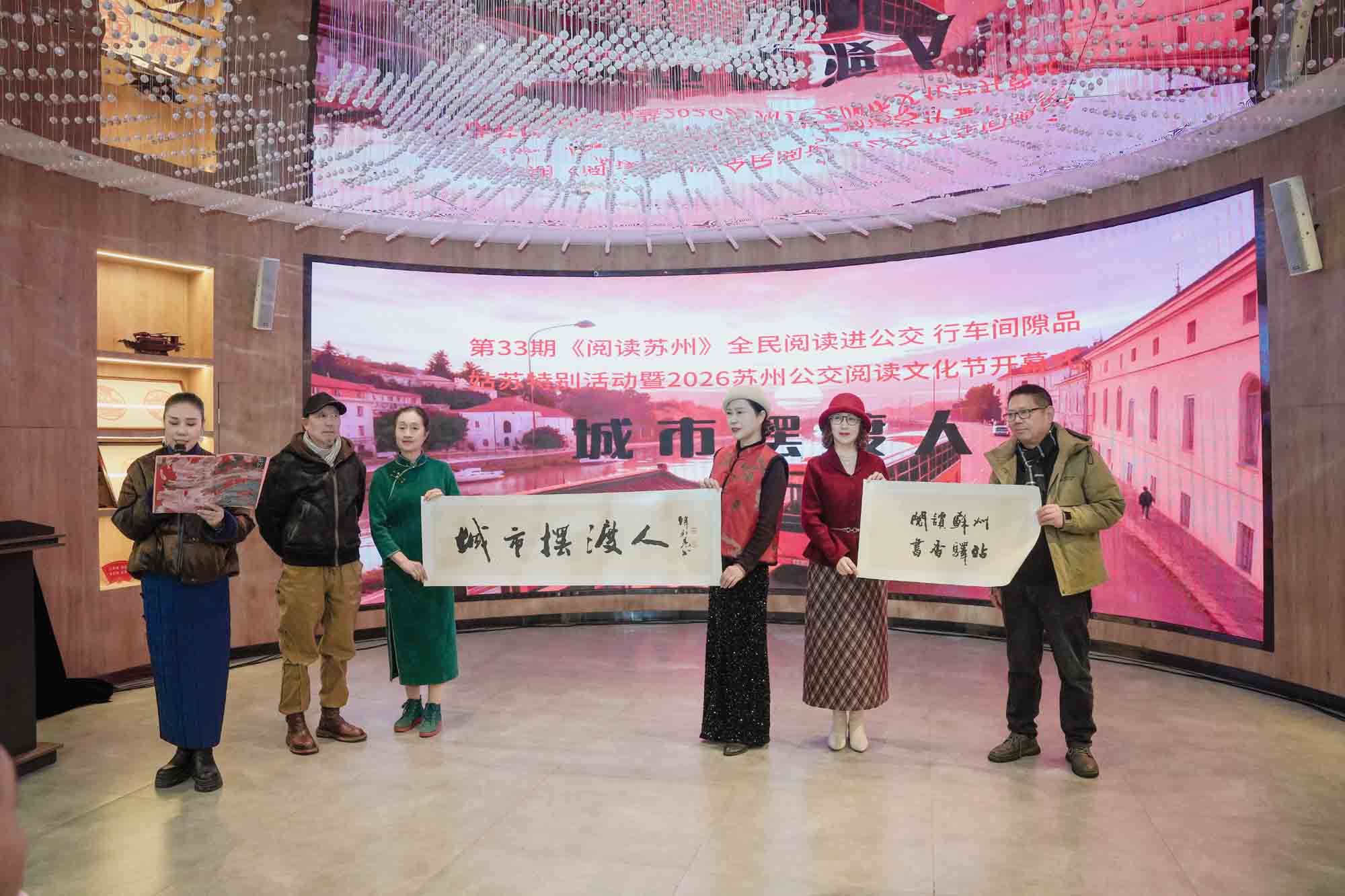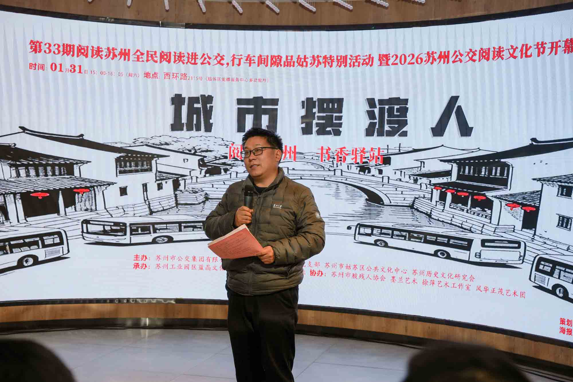 “君到姑苏见,人家尽枕河。”在冬日的清冷中,姑苏城散发着独特的韵味。2026年元月31日下午3点,一场文化盛宴在姑苏区党群服务中心一楼多功能厅精彩上演。此次活动由苏州市公交集团姑苏分公司第二党支部、苏州市姑苏区公共文化中心、苏州历史文化研究会联合主办,苏州工业园区蓝晶文化传播有限公司、丁香文艺社承办,苏州市肢残人协会、墨兰艺术、徐萍艺术工作室、风华正茂艺术团协办,是第33期《阅读苏州》“城市摆渡人·全民阅读进公交,行车间隙品姑苏”活动,同时也是2026苏州公交阅读文化节的开幕式。