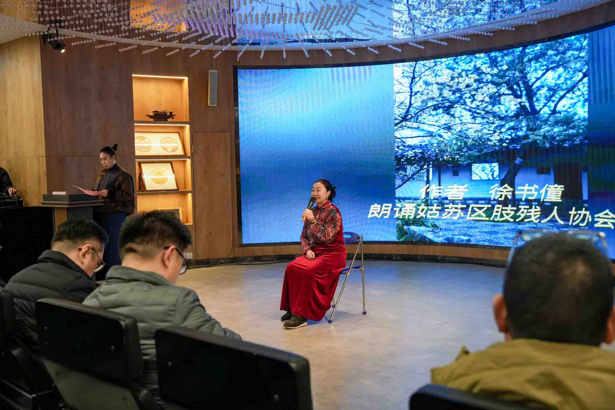 诗文诵读环节无疑是活动的一大亮点。潘琼饱含深情地朗读《苏州最柔美的江南》,每一个字都韵味十足,如同温暖的茶水滋润着人们的心田;姑苏区肢残人协会的高春华带来《沧浪亭的春》,在冬日清冷的场景衬托下,仿佛让大家看到了沧浪亭满园的盎然生机;华乃文朗诵《在虎丘》,千年的虎丘塔影仿佛随着他的笔墨在人们眼前流转,尽显古城深厚的文化底蕴;陈传奇用地道的苏白演绎《桃花坞木刻年画》,那软糯悠扬的语调道尽了姑苏的独特风情。一段段优美的文字与苏州的街巷、亭台、塔影完美融合,让在场的每一个人都在诵读中邂逅了江南的柔情,深刻感受到了文化传承的强大力量。