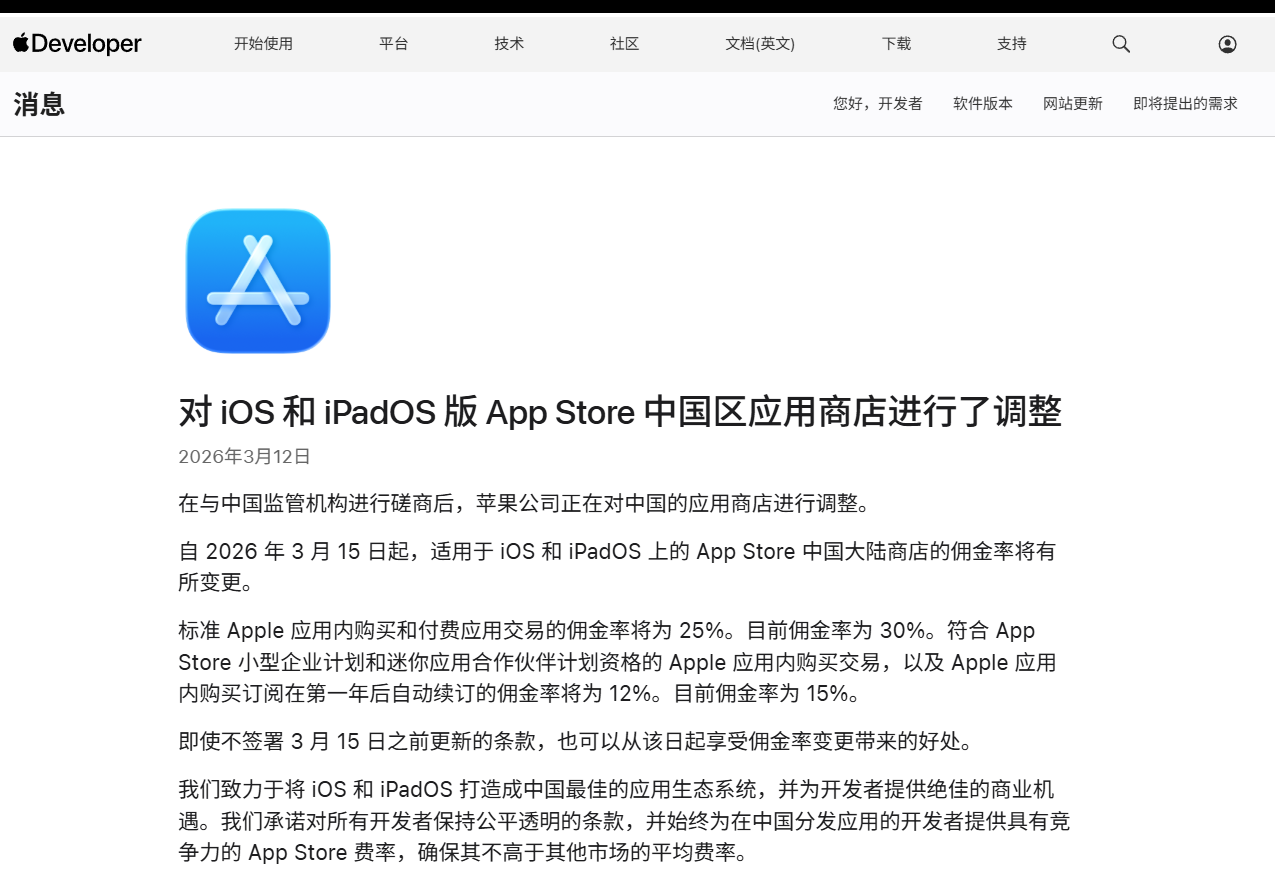 就在北京时间3月12日,苹果官网悄然发布了一则重磅公告(编号:dadukodv)。对于长期关注苹果生态的开发者和极客来说,这不亚于一场行业地震:苹果正式宣布调整中国区App Store的佣金比例。