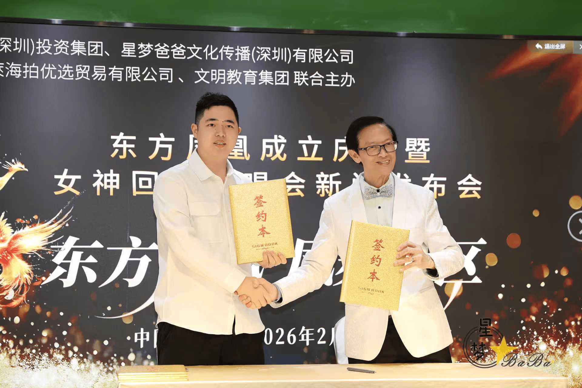 星爸郑锦辉与文明教育集团代表(协办单位)签约,签约后双方合影并拍摄横幅大合影