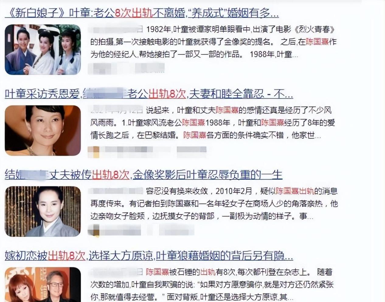 2002年 叶童正在上海拍戏 突然传来了丈夫出轨的消息 陈国熹被拍到与一个性感女明星共同出入酒店 甚至还有当街拥吻的照片 这个消息像炸弹一样 在娱乐圈炸开了锅 所有人都在等待叶童的回应 叶童的粉丝们都在为她打抱不平 谩骂陈国熹 可是让所有人都没想到的是 叶童选择了忍耐