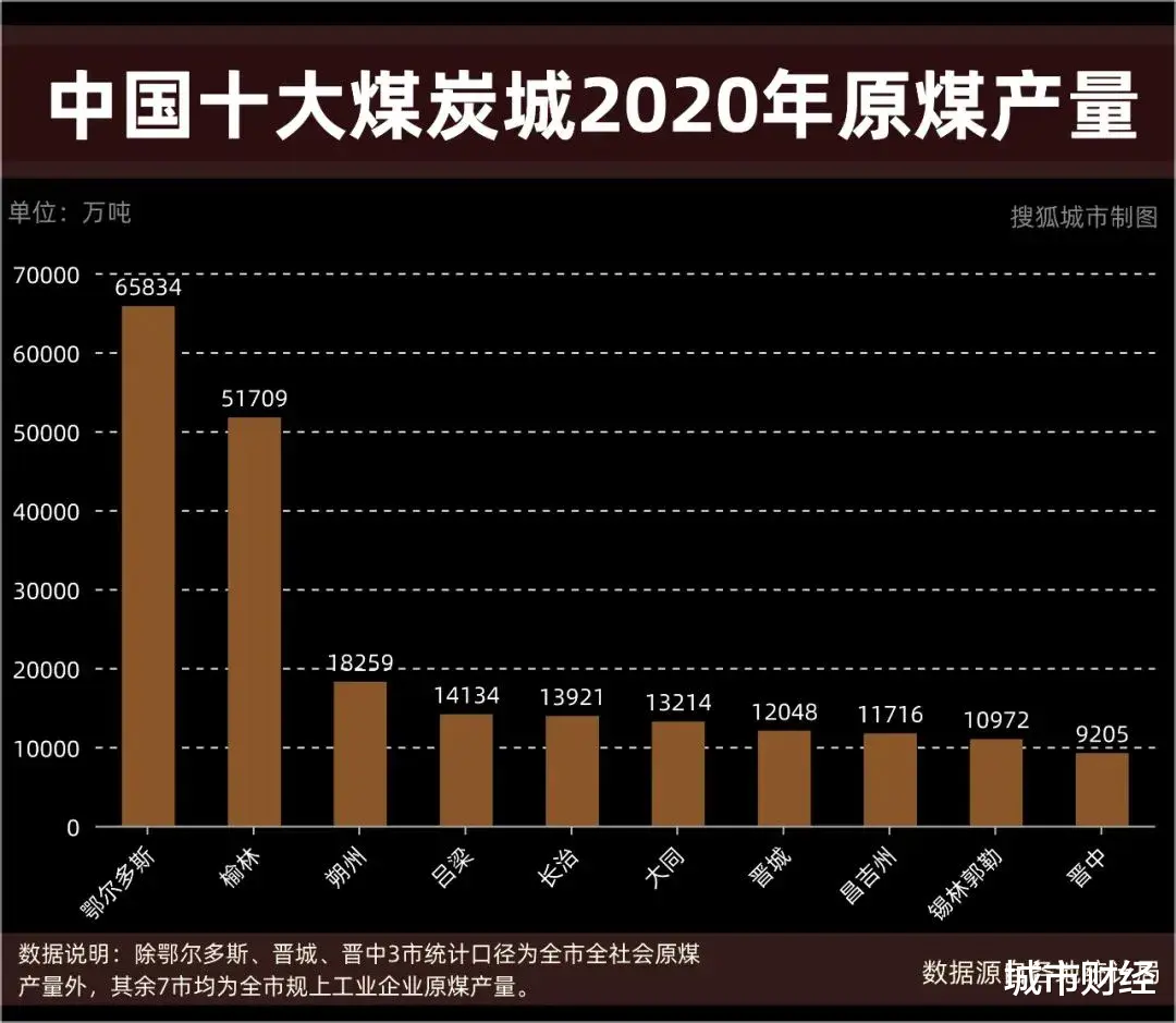 2020年,鄂尔多斯煤炭产量6.58亿吨,大幅领先其他煤炭城市。