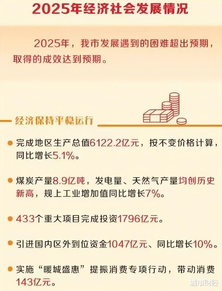 2025年,我市发展遇到的困难超出预期,取得的成效达到预期。2025年完成地区生产总值6122.2亿元,按不变价格计算,同比增长5.1%。