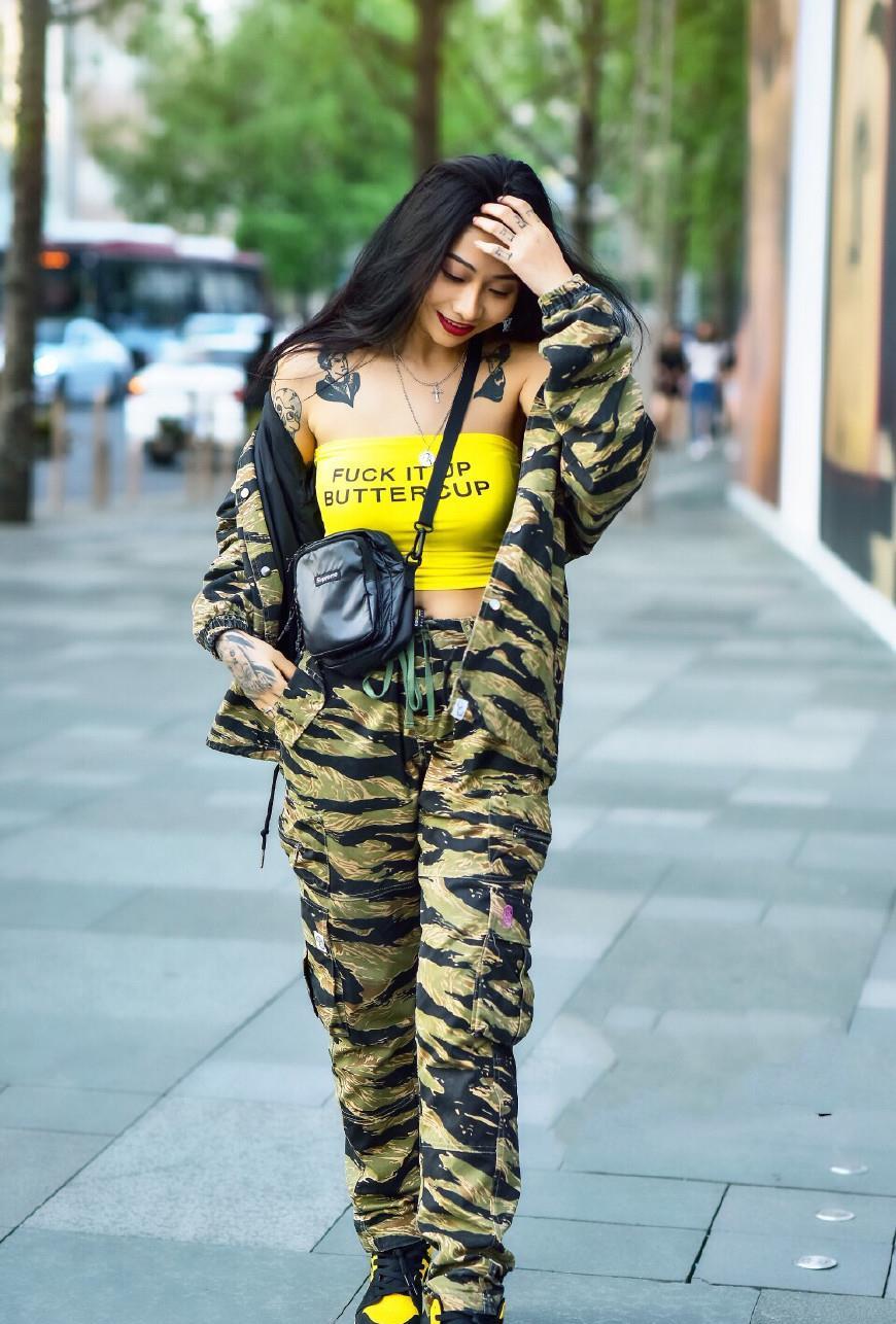 街拍:运动背心+迷彩套装,美女撩头发的姿势撩到我了