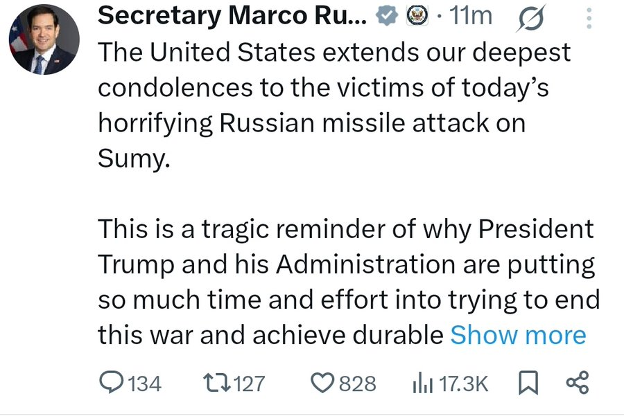 卢比奥发文对在苏梅地区遭受俄罗斯导弹攻击而死亡的乌克兰人表示了哀悼。他是川普团队里为数不多的“正常人”。