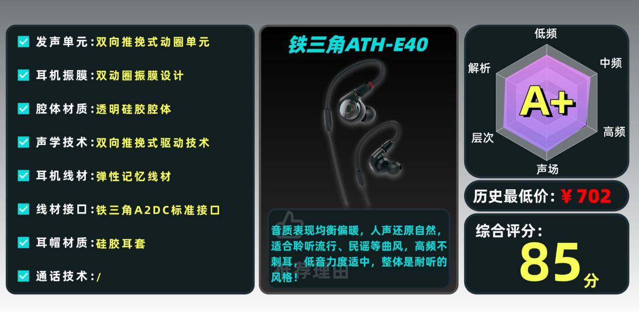 ATH-E40 整体重量轻,塑料腔体表面有细微磨砂质感,手感朴素。厂商提供了多种尺寸硅胶耳塞,适配度比较灵活,但因为腔体不算特别小巧,耳朵偏小或耳廓偏窄的人可能需要花些时间调整佩戴位置。