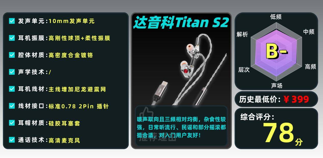 单元使用稀土钕铁硼磁铁和高分子复合振膜,再结合双腔体结构,整体声音偏明亮、高频细节较多,人声距离适中,质感偏干净但略硬,低频量感适中但不是重低音路线。听古典、流行、民谣等偏重声场和解析的音乐,表现不错,但若想要大炮式的低频氛围可能会觉得稍弱。线材为 5N 无氧铜镀银,采用 0.78mm 双针可换线设计,抗干扰能力强,整体质感偏耐用、偏现代。适合喜欢清晰、高解析、不追求厚重低频的人群。