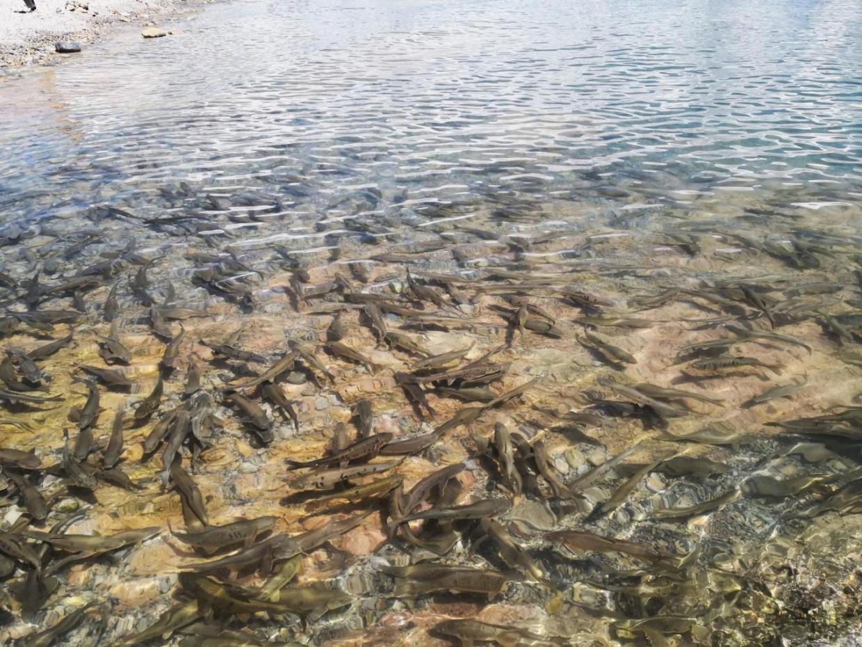 动物界自然也有水陆空,介绍陆上的白牦牛天空的海鸥,自然也少不了 水里 的鱼儿。由于藏民族的传统风俗饮食习惯加之宗教信仰等一系列因素,藏族人民很少吃鱼类生物,于是在这海拔4700米的高原湖泊里面,鱼类的数量有点令人发指的阶段了。因为湖边有人投食糌粑,大鱼小鱼都汇集在湖边浅水,一时间密密麻麻黑压压的一片。