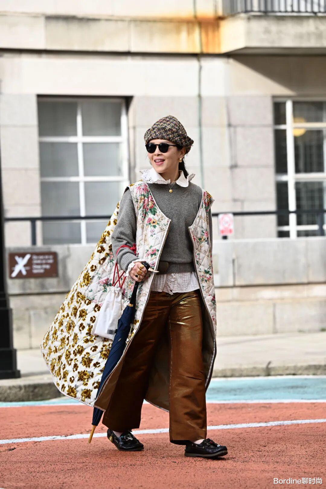 灰色的休闲针织和浅色条纹内搭的搭配增加一些减龄的层次,以棕色皮革直筒裤的搭配低调也多了直线的利落,而搭配的花纹长款马甲则让层次更丰富了一些。
