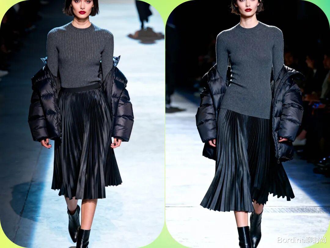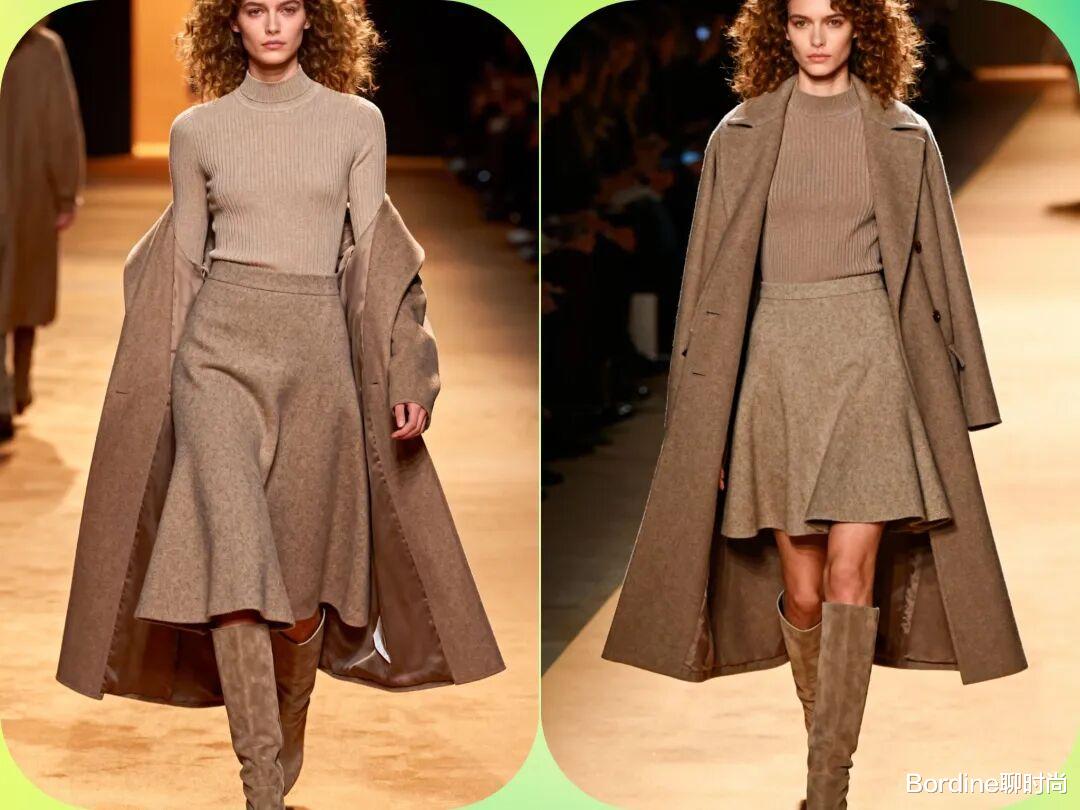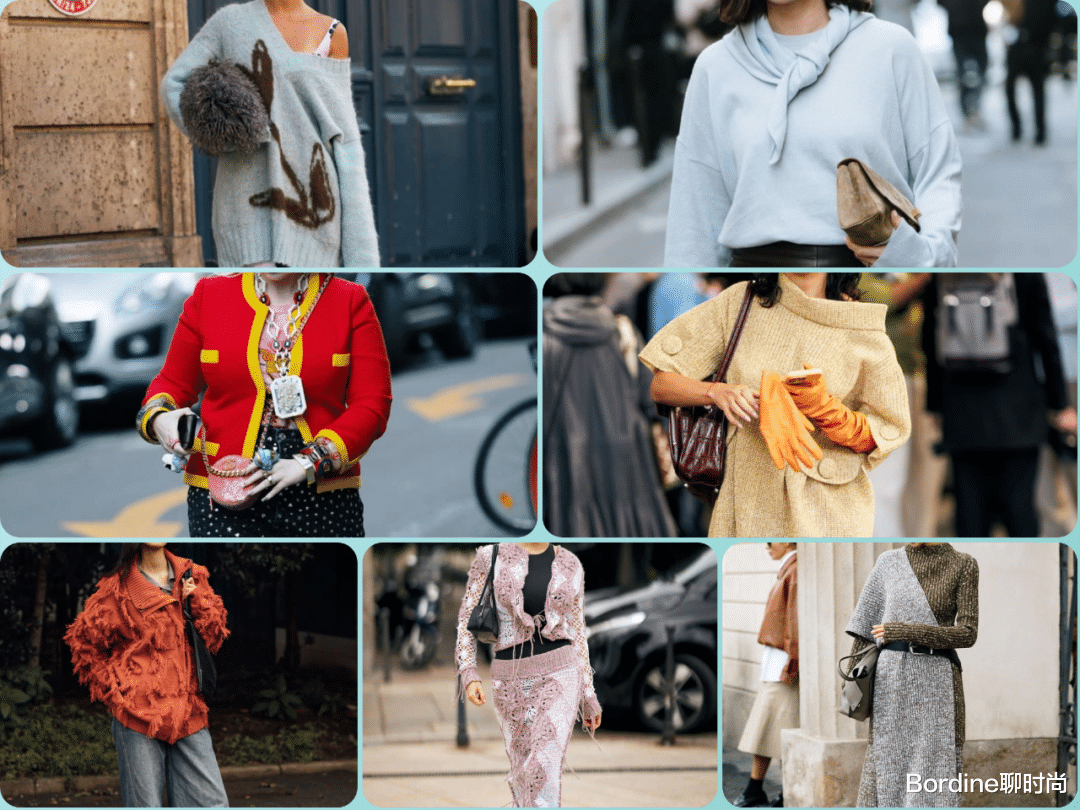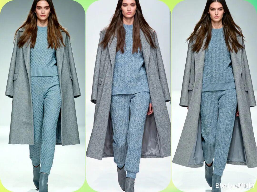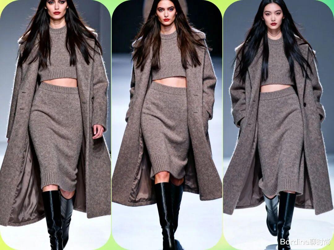 流行趋势:针织套装重回时尚中心,特别是驼色、灰色和黑色的纯色套装。纹理感强的针织材质更受欢迎。亮点展现:通过不同材质的对比(如搭配皮革外套或羽绒马甲)来打破单调感,增加造型层次。