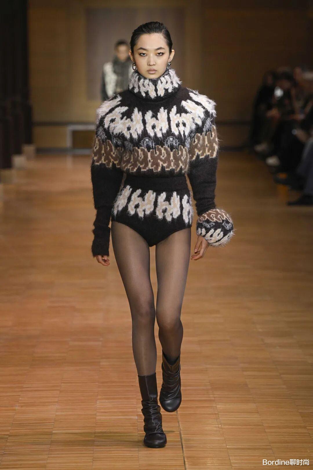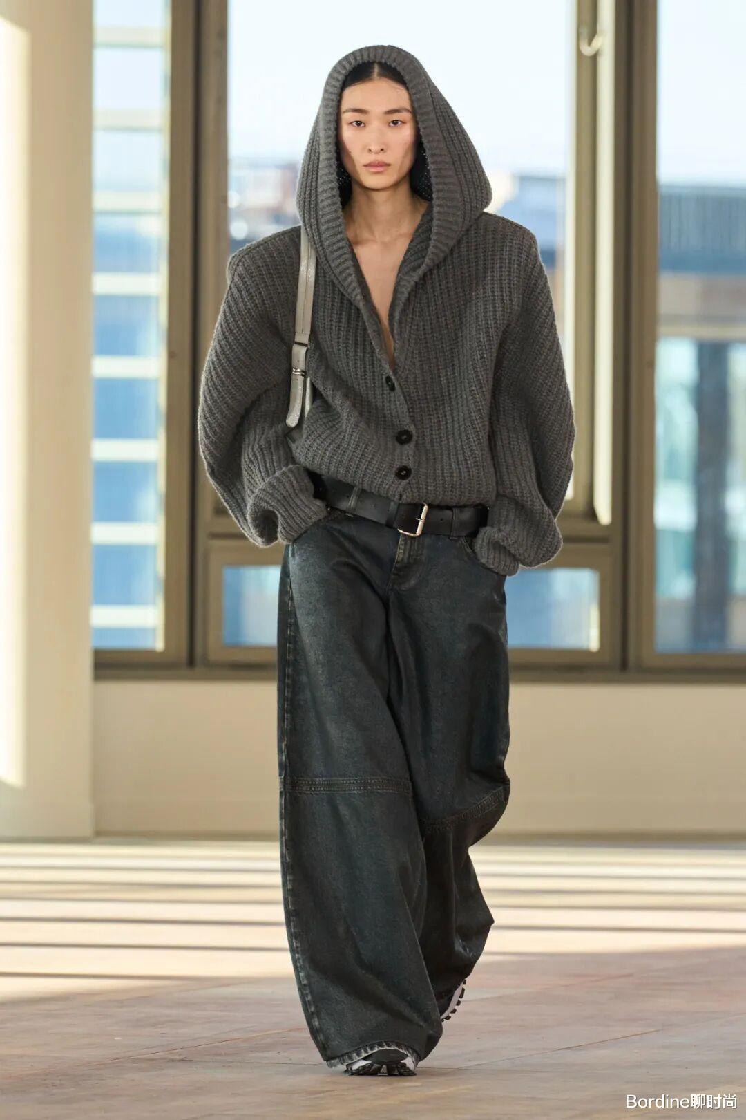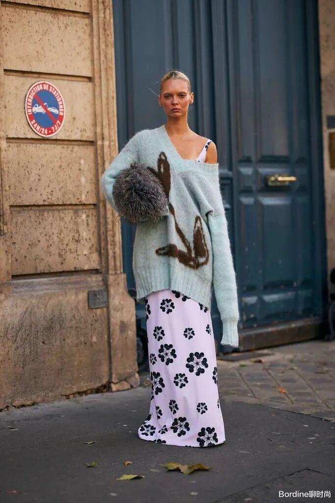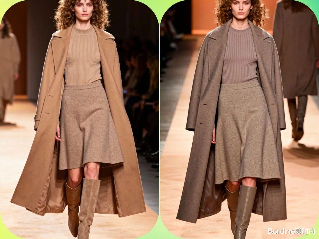 流行趋势:针织套装重回时尚中心,特别是驼色、灰色和黑色的纯色套装。纹理感强的针织材质更受欢迎。亮点展现:通过不同材质的对比(如搭配皮革外套或羽绒马甲)来打破单调感,增加造型层次。