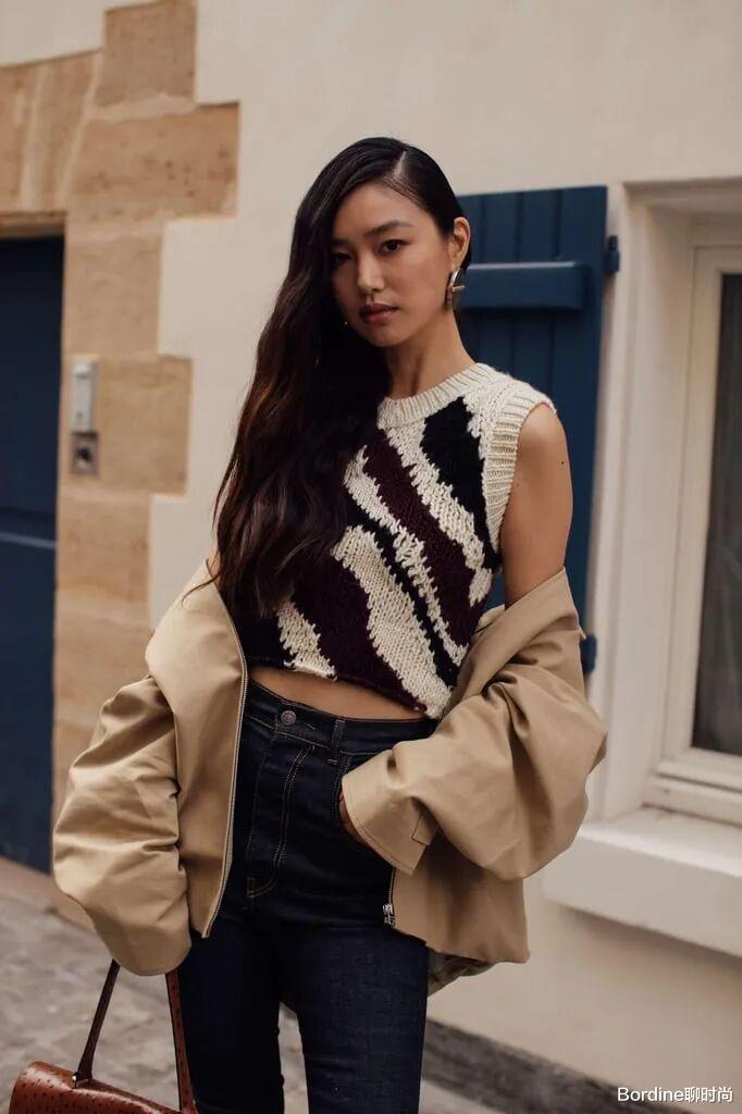 背心上衣在编织的纹理中,短款上衣增加拉高了腰线,在和深色牛仔裤的搭配中,以小蛮腰的露出多一些时髦。