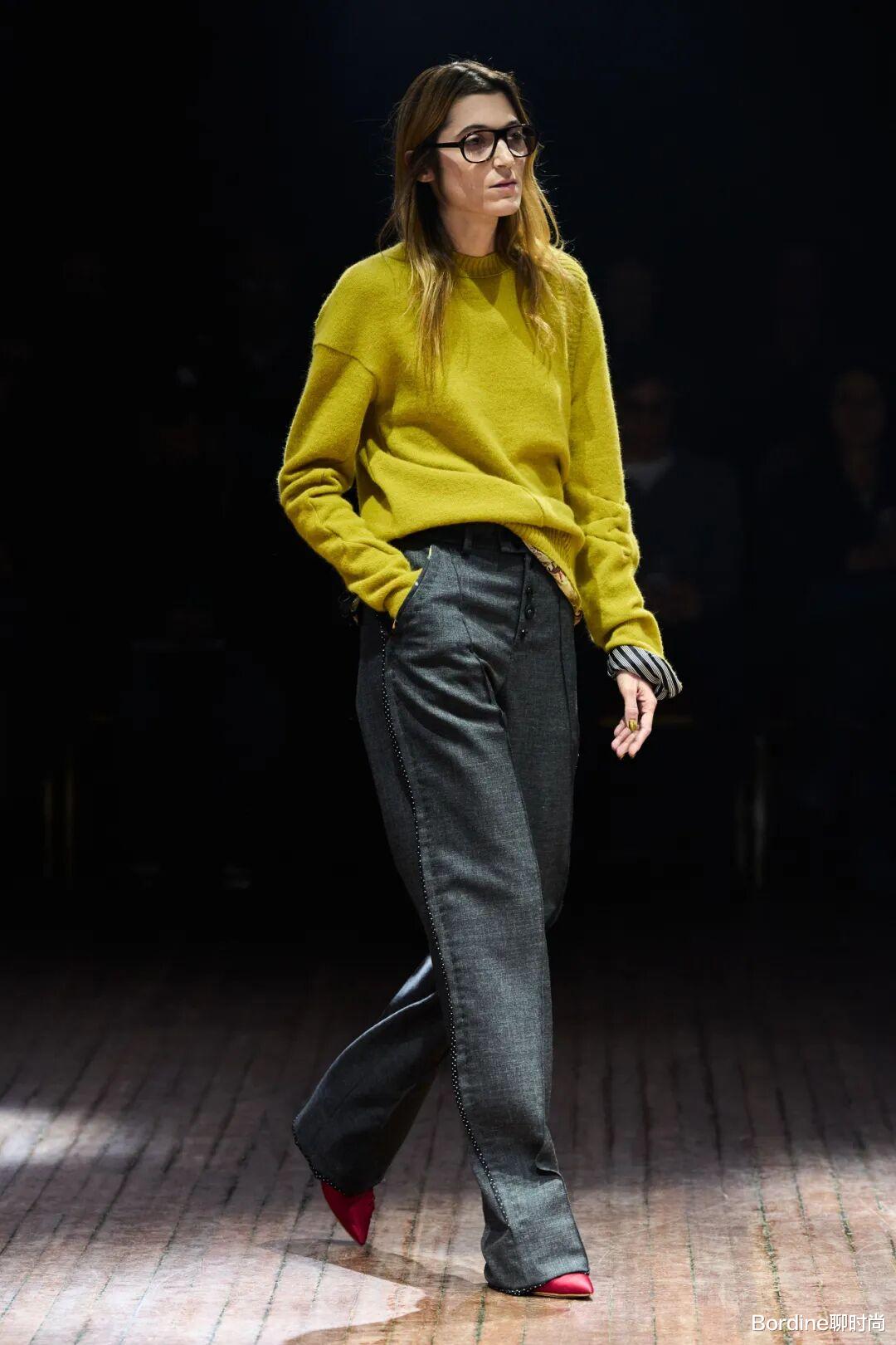 姜黄色针织上衣和灰色直筒裤的搭配,让鲜艳也多了几分低调感,以红色高跟鞋的搭配,打造了吸睛的细节。