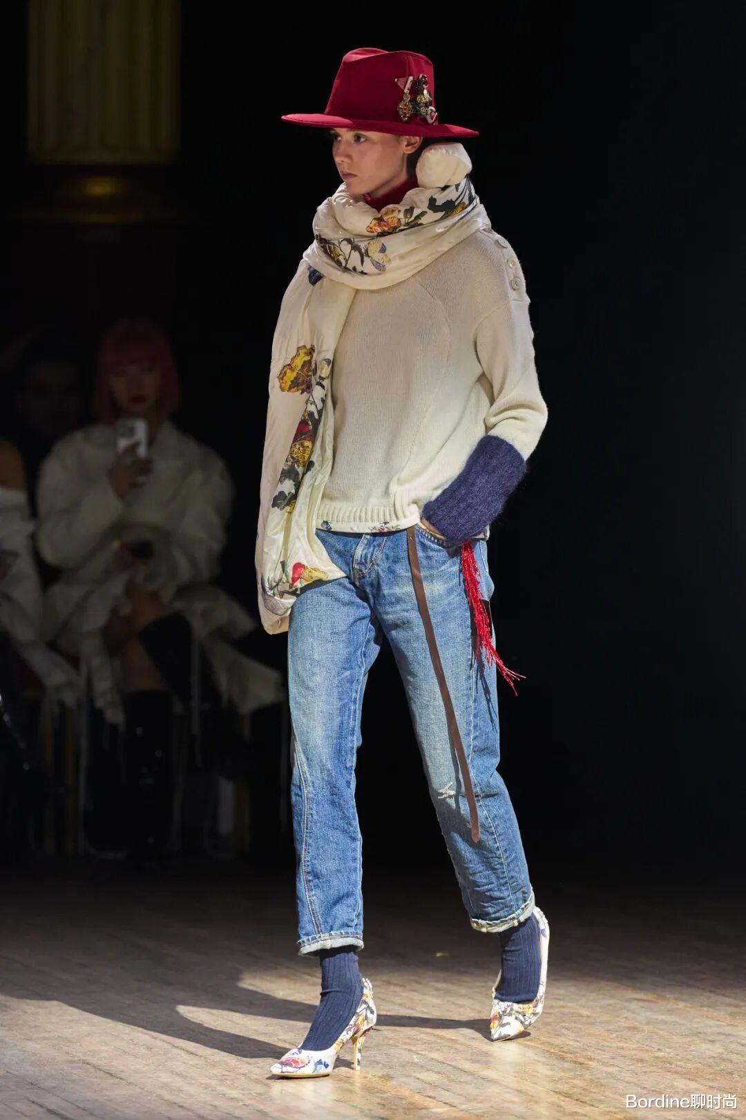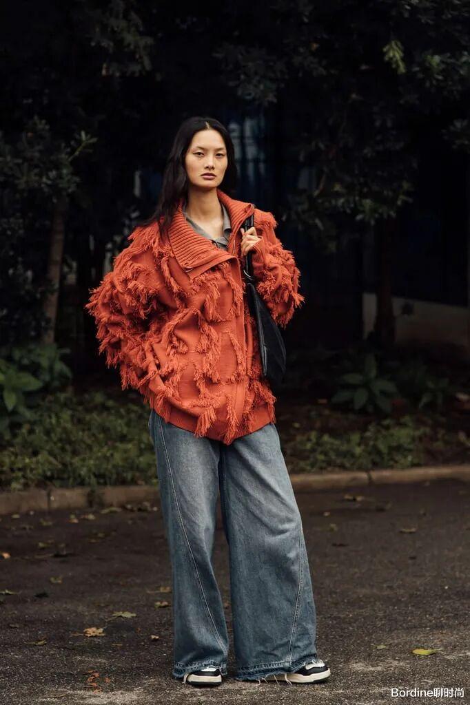 红色针织上衣结合了一些流苏等立体的细节增加了设计感,而和拼接的牛仔裤的搭配,则让穿搭在休闲中有着更多的特色。