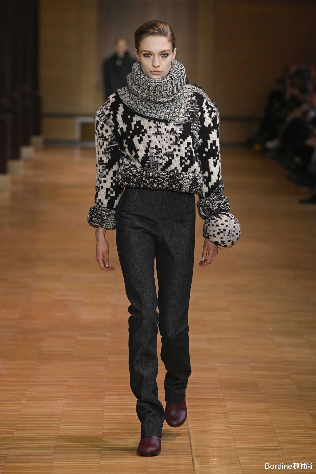 针织的高领上衣在温暖和对脖颈的修饰中,则在这些色彩的对比中结合了编织的工艺也增加了一些图案的活力时尚。