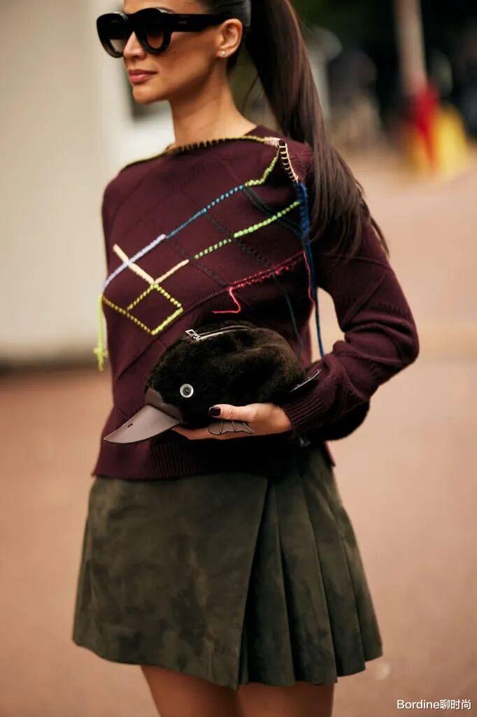 暗红色的上衣在一些其他颜色的对比装饰带来了线条感,以深色褶裙的搭配,减龄也优雅。
