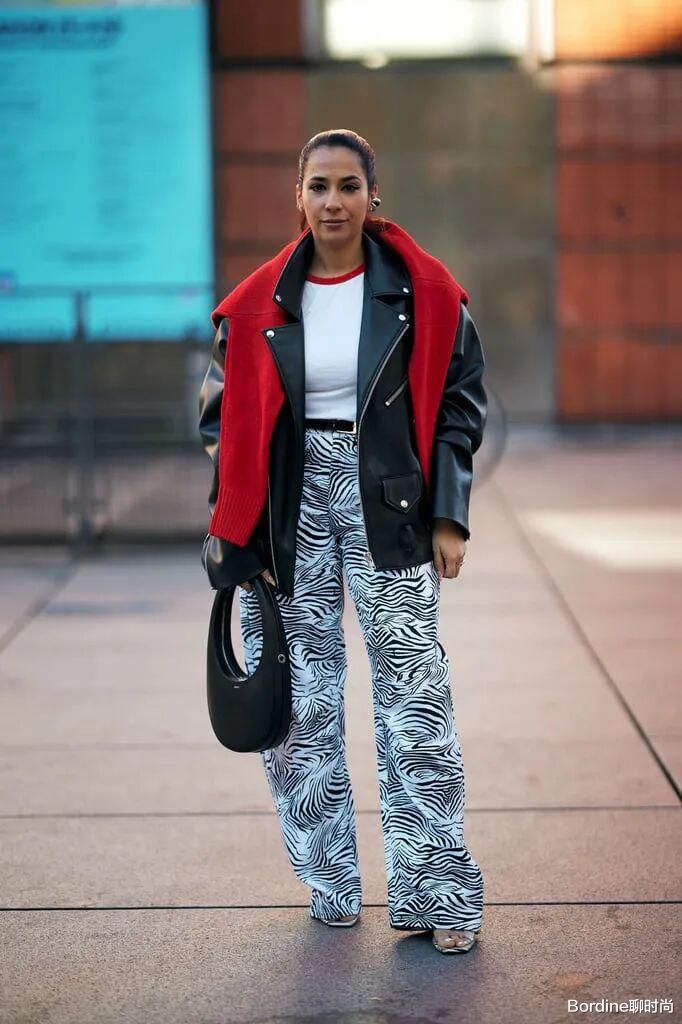 白色休闲内搭和黑色皮夹克的搭配,层次鲜明也多了酷帅气质,而红色针织元素的出现,有着不少的细节和层次时尚。