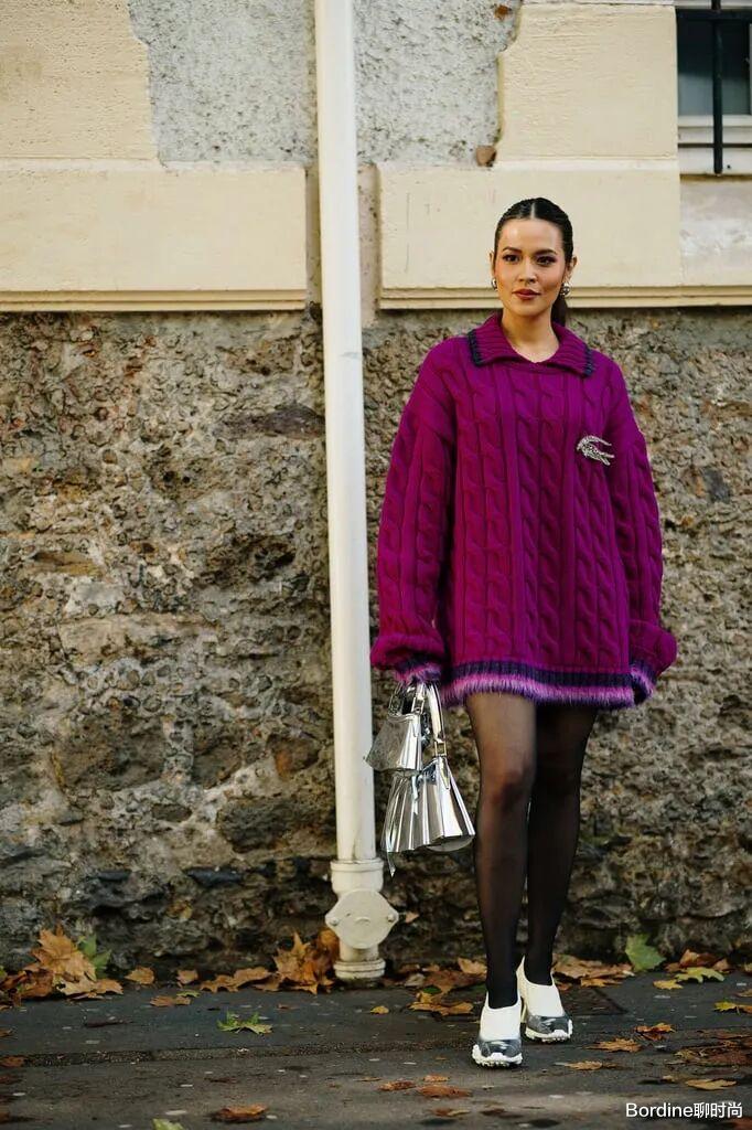 紫色的服装在廓形感的短款连衣裙上,高贵优雅的气质也在编织的纹理花纹上多了一些时髦气质。