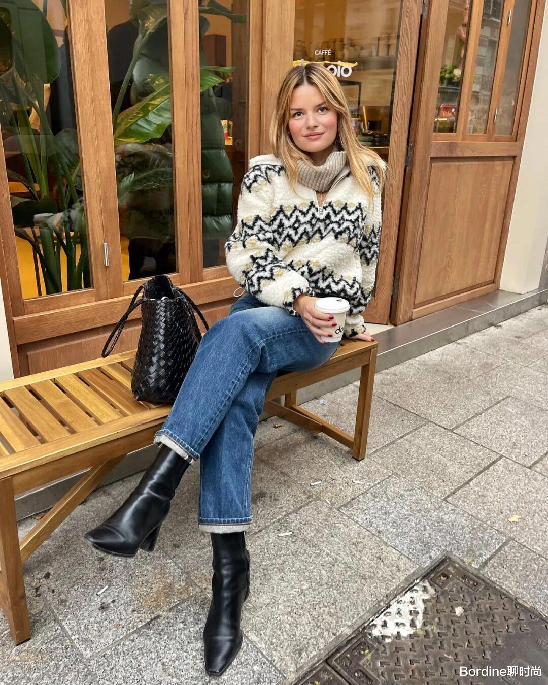 花纹针织的上衣和牛仔裤的搭配,在黑色靴子的搭配中,休闲也有撞色的时尚。