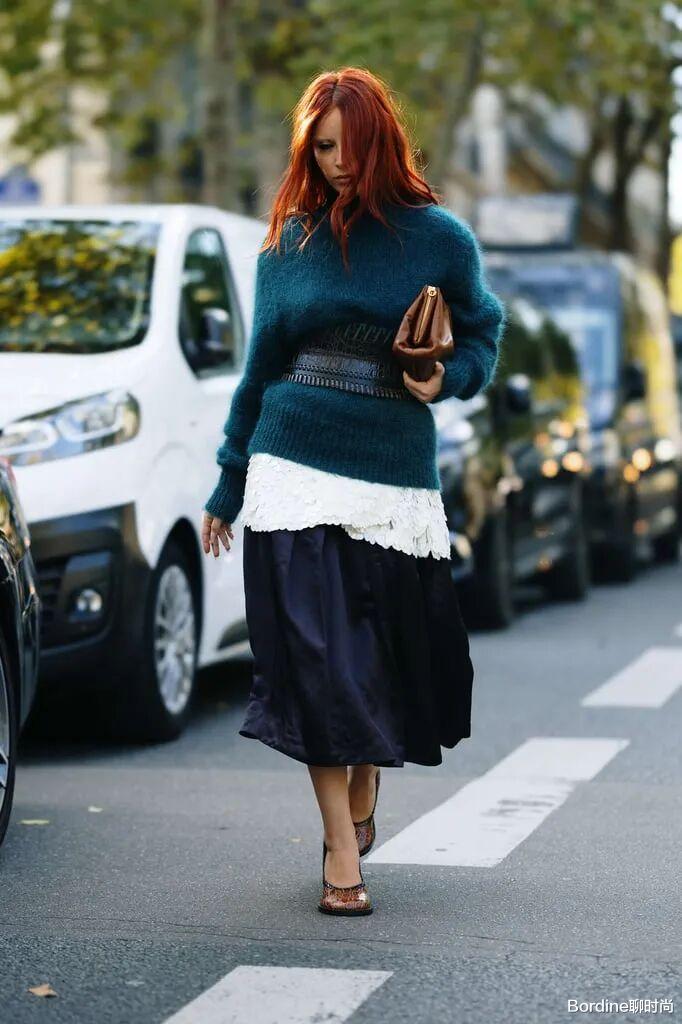 红色针织上衣在和蓝色衬衫元素的搭配,冷暖差异让层次清晰明确,而和棕色丝绒裙装的搭配,也多了高级感。