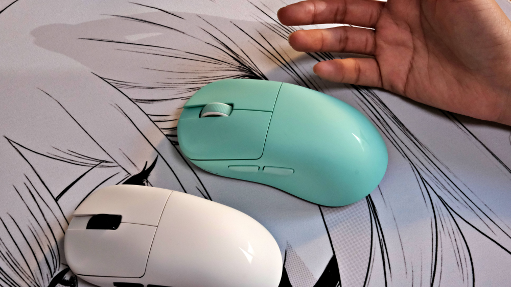 U2V2 Ultimate大师版是全新配色湖水绿,配色太清爽了,比图片里好看 10 倍,摸上去是全新纳米涂层,细腻不滑手,而且防汗效果肉眼可见 —— 我手上有点汗,摸完后鼠标表面完全没痕迹,之前的鼠标早就沾指纹了。