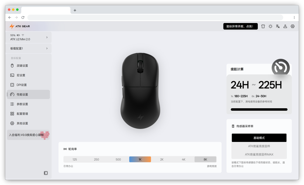 ATK全自研驱动为鼠标带来更多的自定义能力,驱动界面全新设计,支持DPI调节、回报率、自定义宏、按键与编程功能,对用户体验非常好。尤其是网页版无需下载软件,打开官网就能用,相比较其他鼠标使用起来更方便,无惧换机使用。