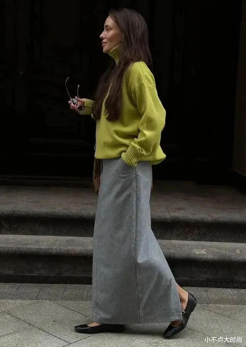 灰色“格雷半裙”搭配芥末绿的毛衣,都是简约基础的款式,配色清新又有几分复古,有生命力又有灰色的低调克制,沉静又时尚,气质有质感,简约又高级。▼