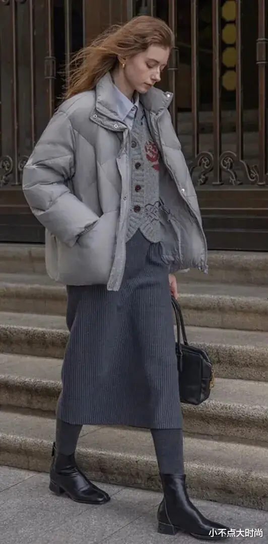 灰色针织衫搭配灰色的羽绒服,内搭灰色奶奶衫、叠穿浅色衬衫,一整套灰色系搭配温和低调又高级,不同面料尽显层次感,时尚又气质。▼