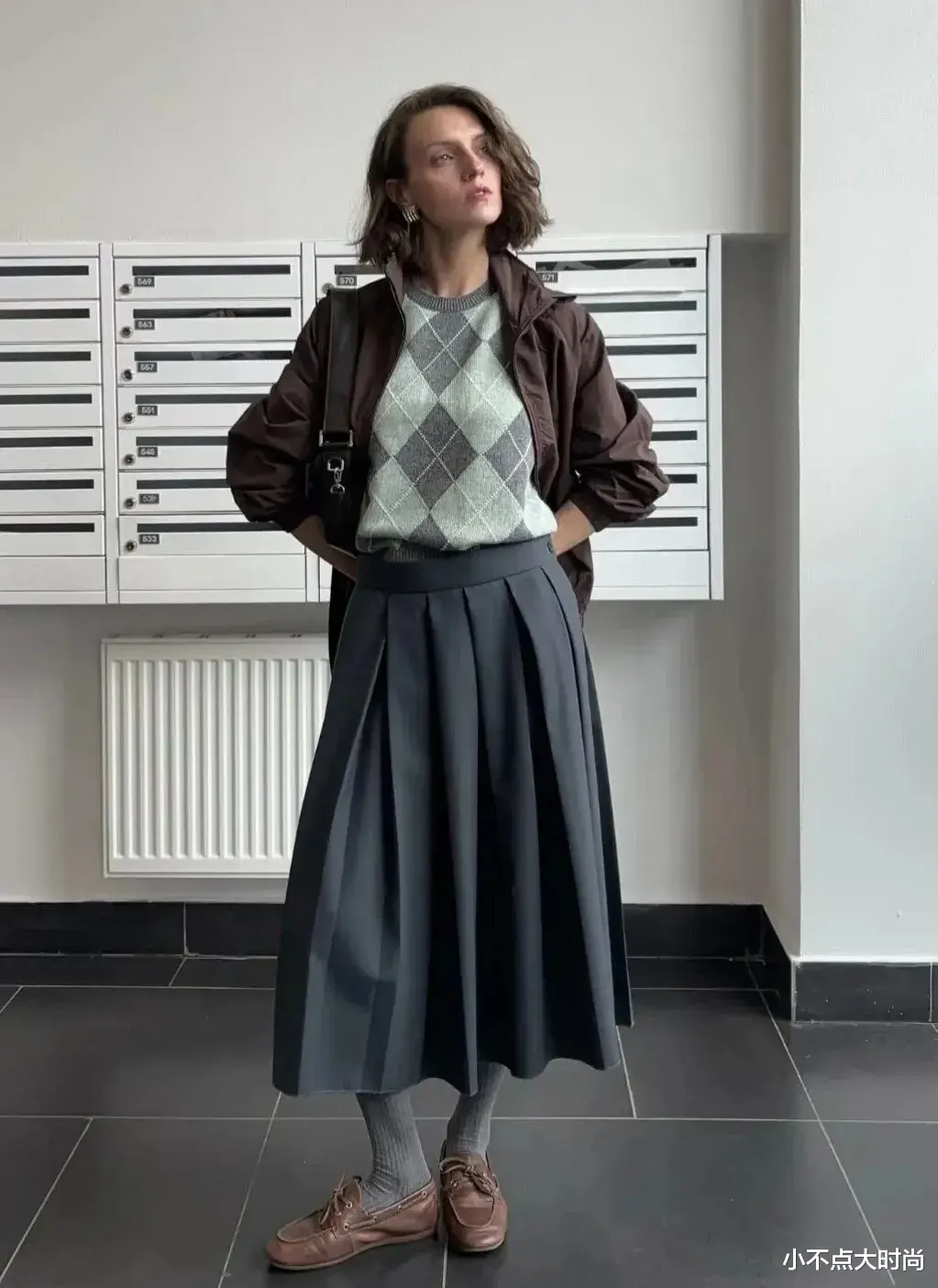 灰色百褶的“格雷半裙”,搭配奶油白的短款皮衣外套,显高显瘦,干净气质又有几分温和的质感。内搭棕色高领衫、叠穿绿色格纹衬衫,复古文艺气息。▼