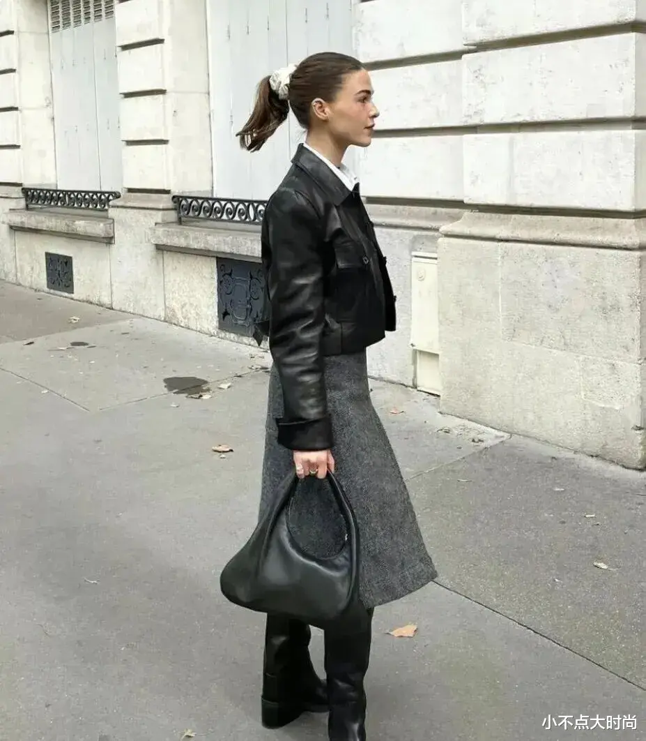 灰色半裙搭配短款黑色皮衣,上短下长的搭配利落又显高,灰色的包容扫除了黑色皮衣的刚硬,让搭配干净利落又有温和沉静的气韵在,耐看又高级。▼