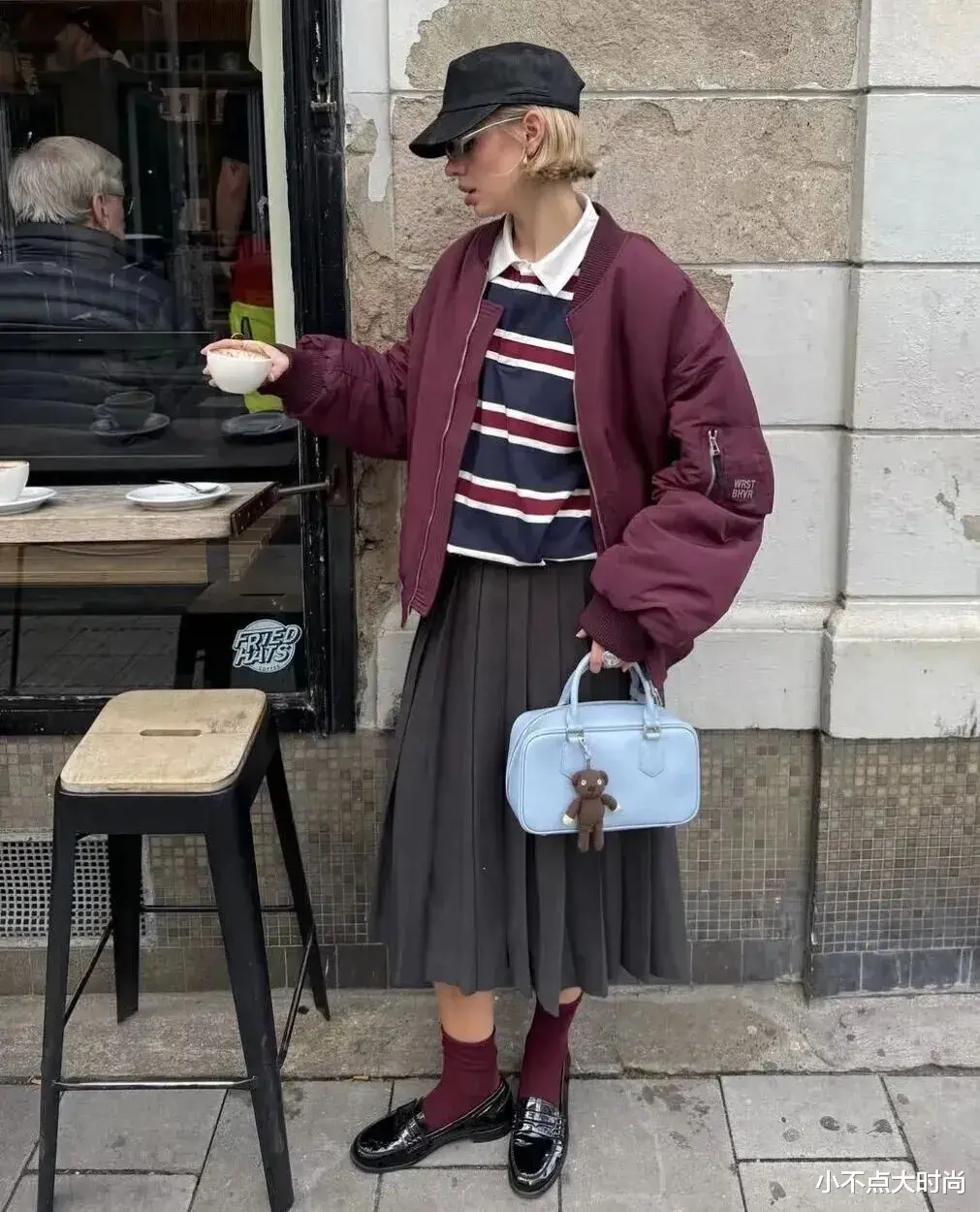 灰色百褶半裙搭配复古红色的棒球服棉外套,脚上的袜子也是复古红色,呼应外套,手提的是清新蓝色的小包包,只有灰色的包容才能让这些彩色协调又有质感,时髦大方又高级。▼
