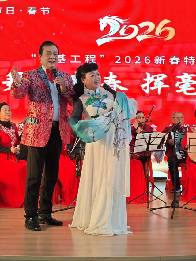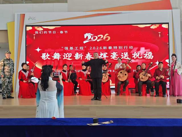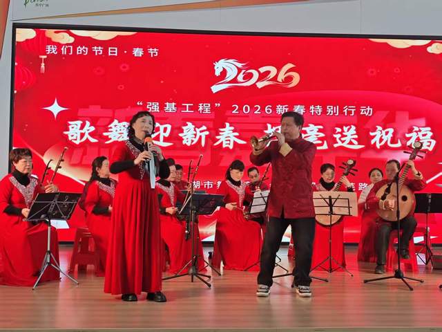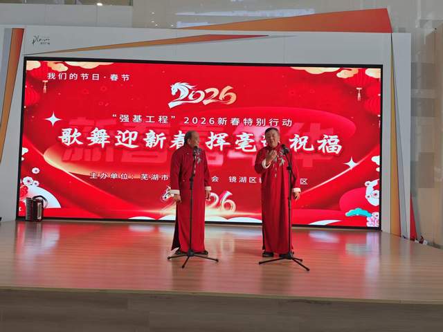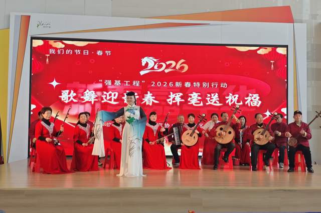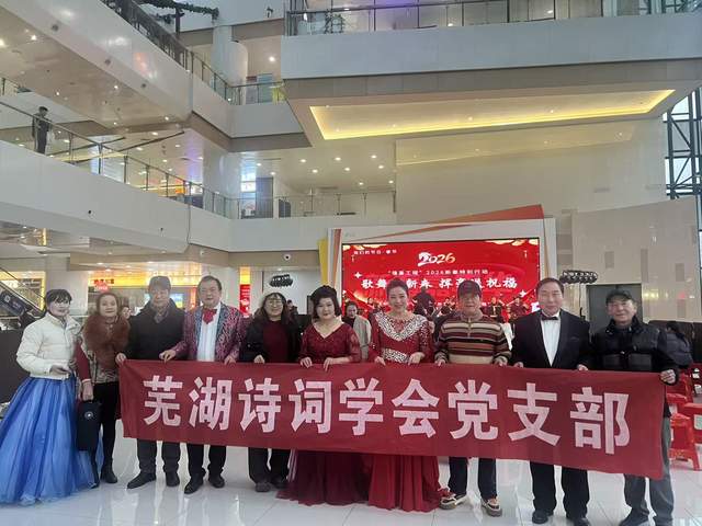 腊月,年味正浓。2026年2月6日下午,安徽省芜湖市镜湖区苏宁广场内锣鼓喧天、歌舞飞扬,“我们的节日·春节——‘强基工程’2026新春特别行动暨‘歌舞迎新春 挥毫送祝福’新春嘉年华”在这里火热举行。此次活动由芜湖市舞蹈家协会、芜湖市新芜路社区联合主办,芜湖诗词学会《春去春又来》爱心一家亲艺术团、镜湖民乐团共同协办,为即将到来的农历新年献上了一场精彩纷呈的文化盛宴,将党的温暖和文艺的馨香送到了百姓心坎上。