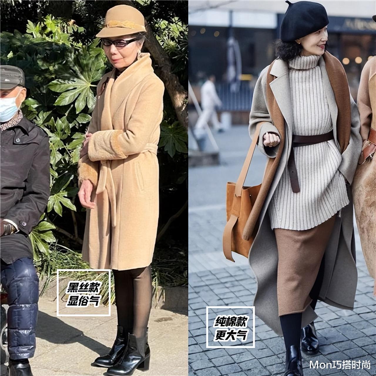 当然,也有不少爱打扮的阿姨喜欢穿丝袜,但冬季穿薄薄的一条丝袜实在是扛不住,于是她们就转战加绒黑色打底裤了,这种打底裤其实就是在常规的打底裤外面加了一层黑色,看起来好像挺性感的,也没有光腿神器的假肢感,但穿在腿上特别容易显得低俗和廉价,非常不符合中年女人的气质。