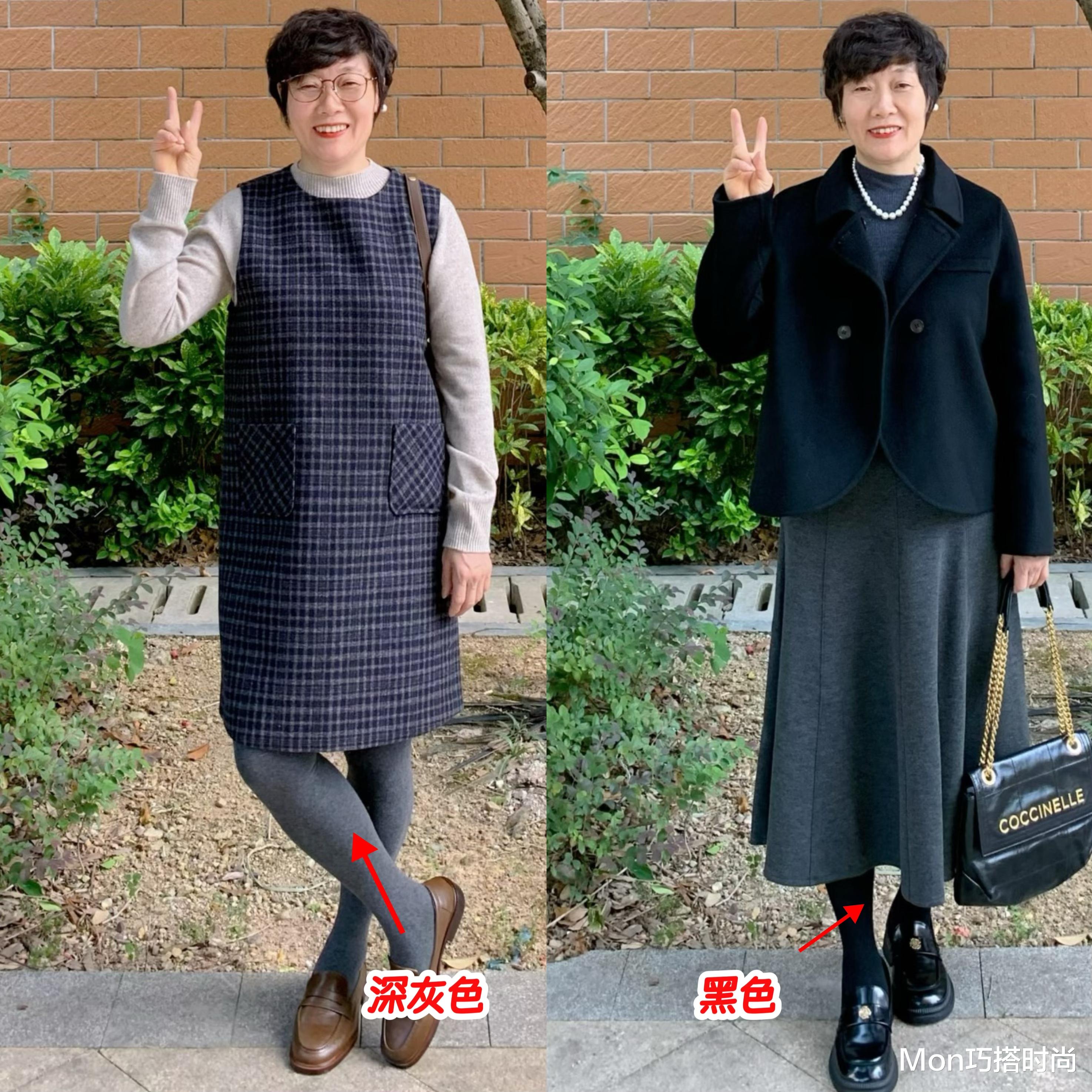还是那句话,要是选打底裤就老老实实地选深色吧,像这种黑色或者深灰色的打底裤,真的比光腿神器款的打底裤看起来优雅多了,材质可以选竖纹款的,穿在身上不会产生膨胀感,腿粗的阿姨们也可以放心穿。