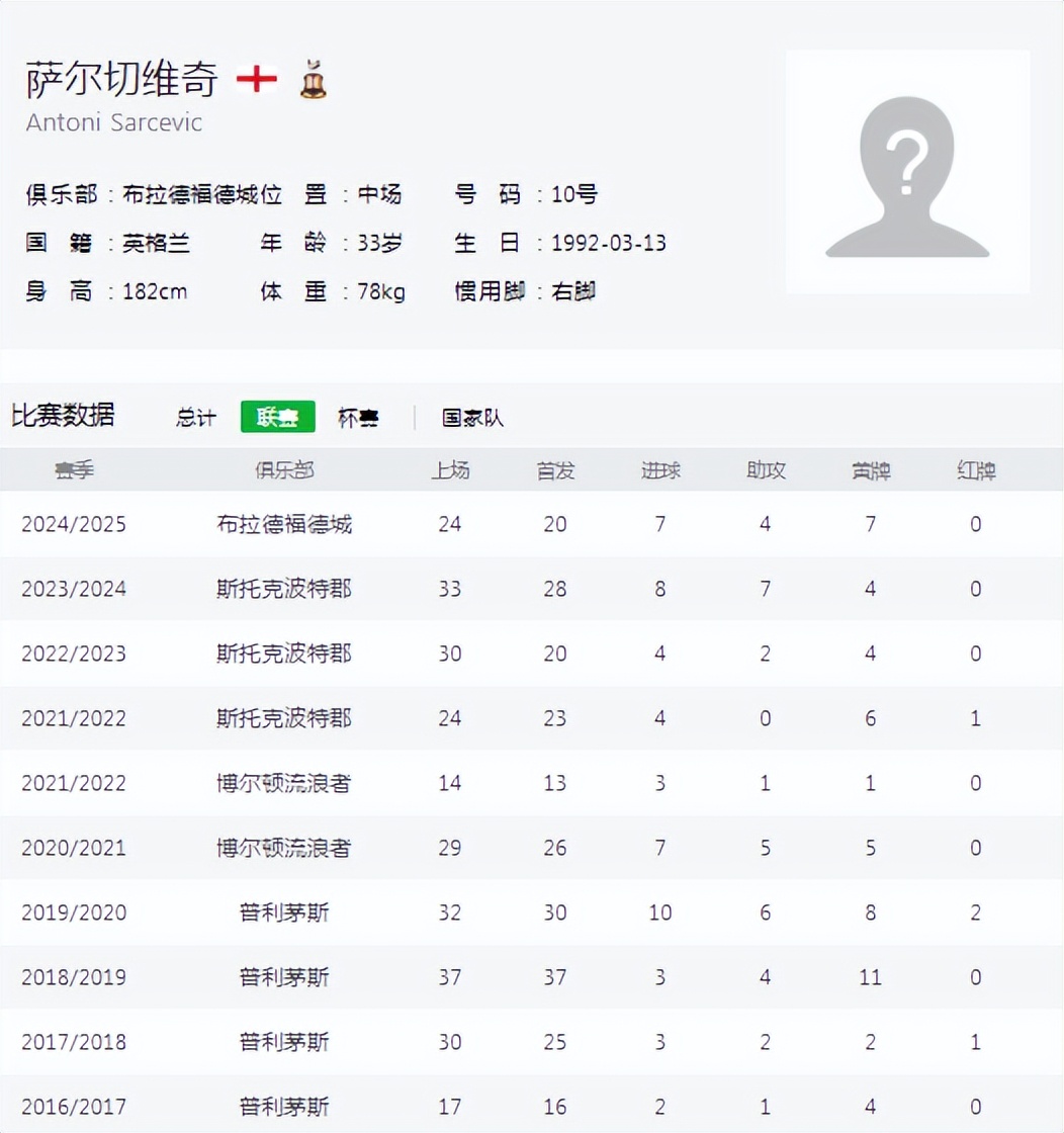 萨尔切维奇的“升级圣体”名声在英格兰低级别赛场早已家喻户晓,本赛季跟随布拉德福德冲甲成功之后,包括沃尔索尔、诺茨郡在内的球队都在联系他,这位33岁的中场球员有望在新赛季完成职业生涯第9次升级之旅。