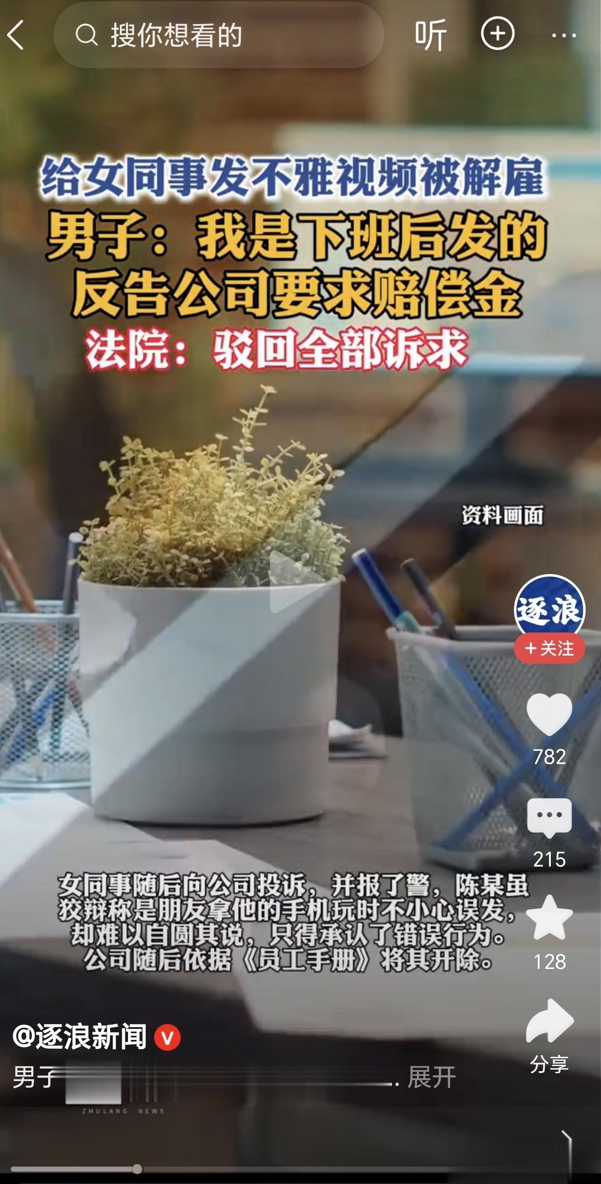 但法院的判决直接驳回了他的诉求。根据《民法典》规定,发送不雅视频属于明确的性骚扰行为,其认定与是否在上班时间无关,只要侵害他人人格权,就需承担责任。同时,陈某已签字确认知晓《员工手册》,公司开除程序合法、依据充分。最终,陈某不仅没拿到一分赔偿金,还落得职场声名狼藉的下场。